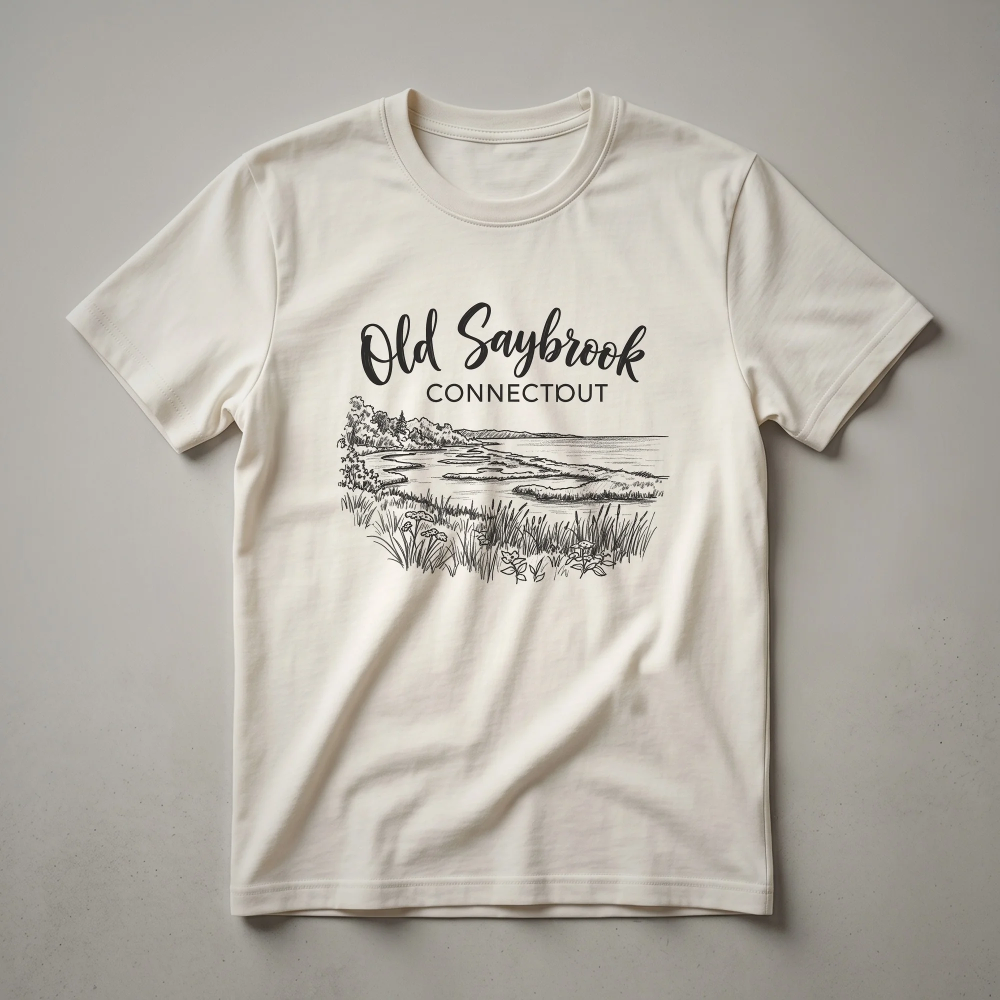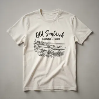 Old Saybrook, Connecticut, a picturesque town nestled at the mouth of the Connecticut River, is beautifully captured in this sketch-style graphic tee. The design features the town's name in elegant script above "CONNECTICUT" in block letters. Below, a detailed line drawing depicts a serene waterscape, complete with reeds, grasses, and distant trees, evoking the natural beauty of the Connecticut coastline. This shirt is a thoughtful gift for residents, former inhabitants, or anyone who holds fond memories of Old Saybrook's coastal charm and historic appeal. It's a staple in the collection for those who appreciate vintage-inspired travel art and want to wear their connection to this beloved New England location. This tee works well for casual outings, exploring local shops, or simply relaxing while reminiscing about the seaside. Wear it to remember the tranquility of the Connecticut River meeting the Long Island Sound, a defining feature of this historic town. This apparel celebrates the unique spirit of Old Saybrook.