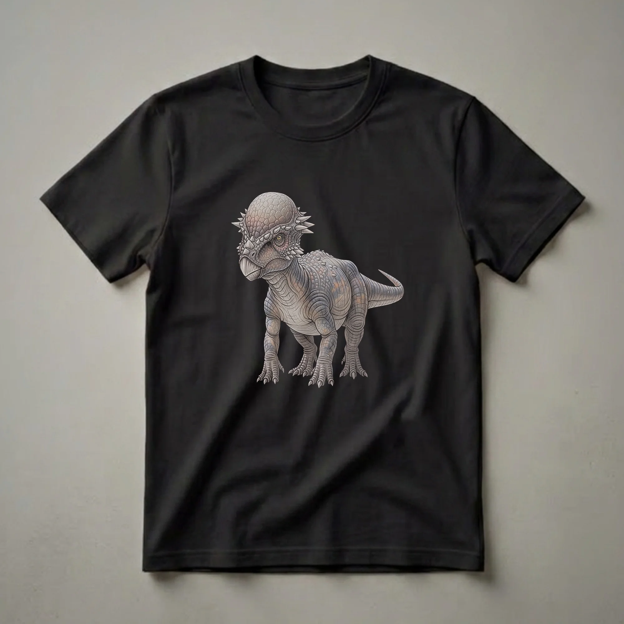 Paleontology enthusiasts will appreciate the intricate detail in this Pachycephalosaurus drawing t-shirt. This striking graphic features the distinctive domed skull and bony frill of the Pachycephalosaurus, a dinosaur known for its head-butting behavior. This herbivorous dinosaur roamed the Earth during the Late Cretaceous period, approximately 70 to 66 million years ago, in what is now North America. The artwork captures the textured scales and powerful build of this fascinating creature, making it a standout piece for any dinosaur lover. This unique tee is a staple in the collection for anyone fascinated by ancient life. It makes a thoughtful gift for the dinosaur aficionado in your life who enjoys learning about prehistoric eras. Wear this shirt to a museum exhibit, a dinosaur-themed event, or simply as a conversation starter on casual outings.