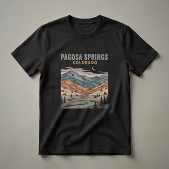 Pagosa Springs, Colorado, is renowned for its stunning natural beauty, and this graphic tee captures that essence with a retro-inspired landscape. The artwork depicts a winding river flowing through a valley, flanked by rolling hills and majestic mountains under a night sky with a crescent moon. Pine trees dot the foreground and hillsides, adding to the serene, wilderness feel. The text "PAGOSA SPRINGS" is displayed prominently in a distressed, vintage font, with "COLORADO" beneath it. This shirt is a perfect way for residents and visitors to express their connection to this picturesque Colorado town. Pagosa Springs is nestled in the San Juan Mountains, a region known for its abundant hot springs and outdoor recreational opportunities, including hiking and fishing in the San Juan River. This tee works well for anyone who appreciates the rugged charm of the American West or is looking for a unique souvenir from their travels. It makes a thoughtful gift for friends or family who have a special place in their heart for Colorado's mountain towns. Wear this shirt on your next outdoor adventure or casual outing to showcase your Colorado pride.