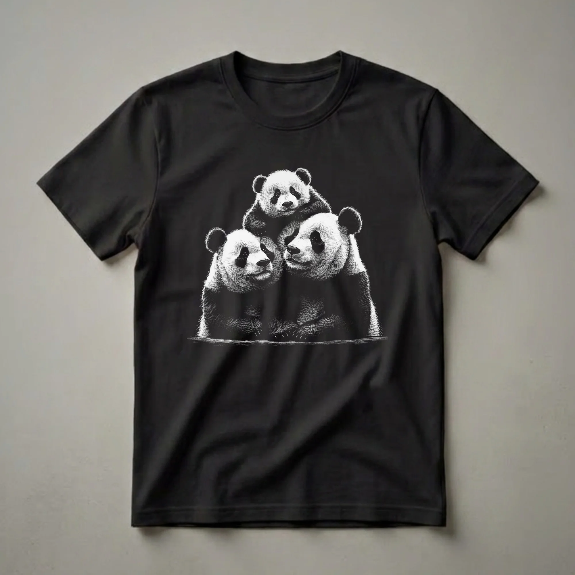 Panda moms and dads will adore this unique t-shirt featuring a detailed scratchboard illustration of a panda family. The artwork depicts two adult giant pandas, their faces turned slightly, with a young cub nestled on top, gazing forward with innocent eyes. The monochromatic style emphasizes the texture of their fur and the gentle expressions of the bears. Giant pandas, native to China, are known for their distinctive black and white markings and their diet primarily consisting of bamboo. This striking graphic tee captures the tender bond within a panda family, making it a wonderful choice for anyone who appreciates wildlife art. This shirt works well for nature lovers or as a thoughtful gift for Mother's Day, celebrating the maternal bond. Wear this eye-catching tee to a zoo visit, a nature walk, or simply when you want to share your passion for these beloved creatures. It's a staple in the collection for any panda enthusiast.