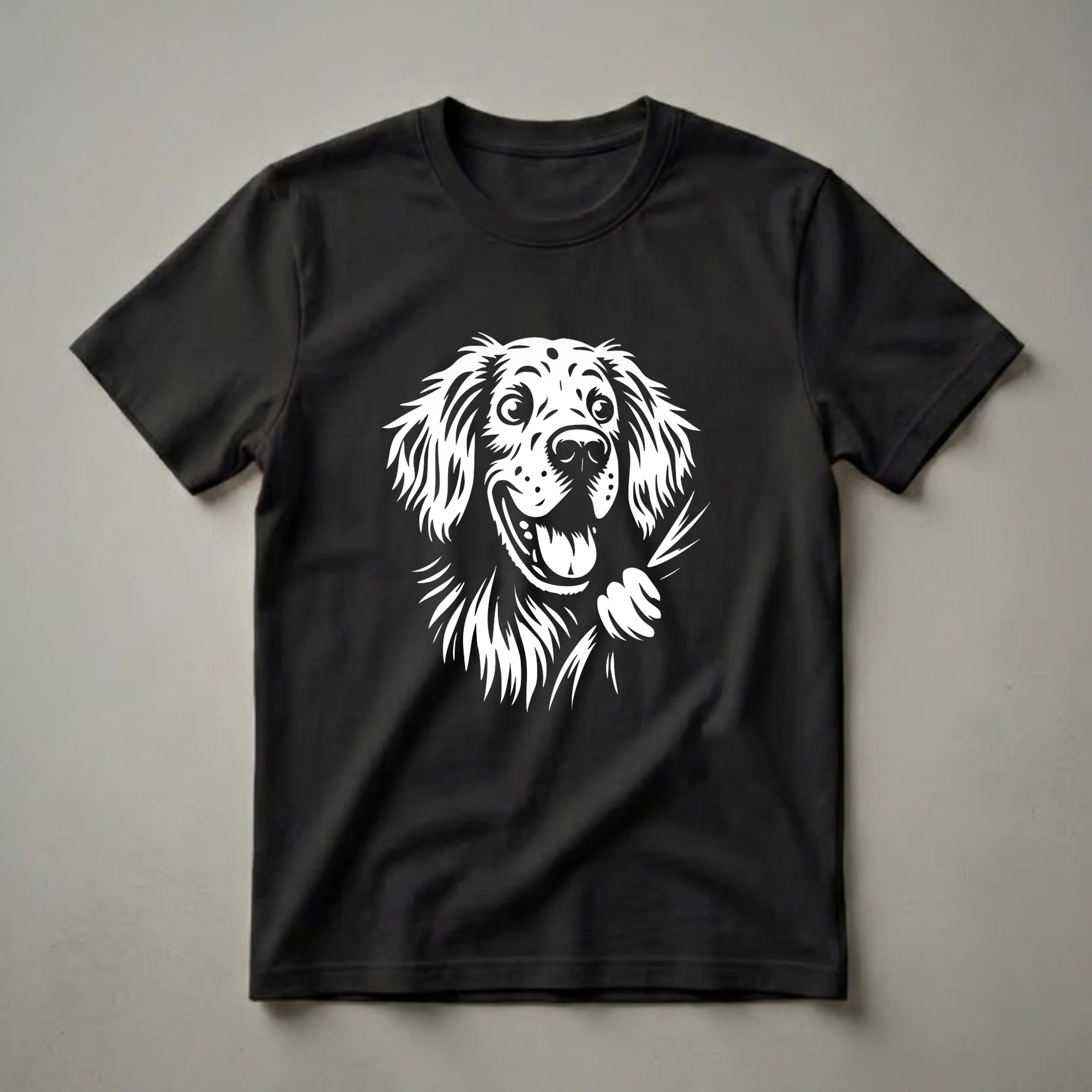 Showcase your adoration for the elegant English Setter with this charming graphic featuring a joyful pup peeking out with a happy, lolling tongue. This graphic tee captures that spirit with a playful peeking English Setter design. The artwork features a white, stylized illustration of the dog's face, complete with wide, expressive eyes, a wet nose, and a lolling tongue, giving it an undeniably cheerful and inviting look. The dog's fur is depicted with flowing lines, suggesting its characteristic coat. English Setters, originally bred in England for hunting game birds, are known for their elegant appearance and friendly disposition, making them beloved family pets. This t-shirt is a wonderful way for any English Setter mom or dad to express their affection for their four-legged friend. It makes a thoughtful gift for birthdays, holidays, or just because. Wear this shirt to the dog park, on casual outings, or while relaxing at home, and let your passion for this magnificent breed shine through. It's a staple in the collection for any devoted dog enthusiast.