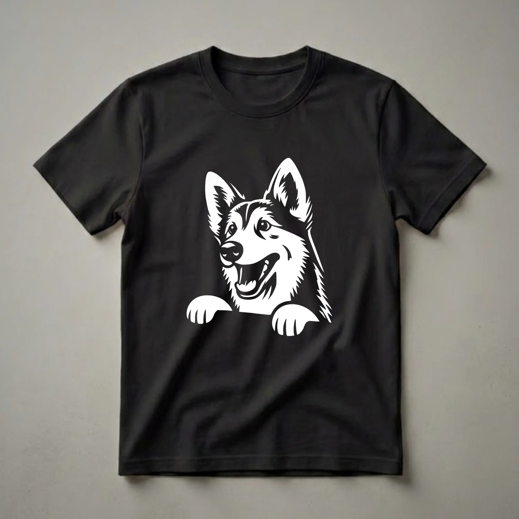 - Graphic t-shirt featuring a peeking Norwegian Elkhound design.