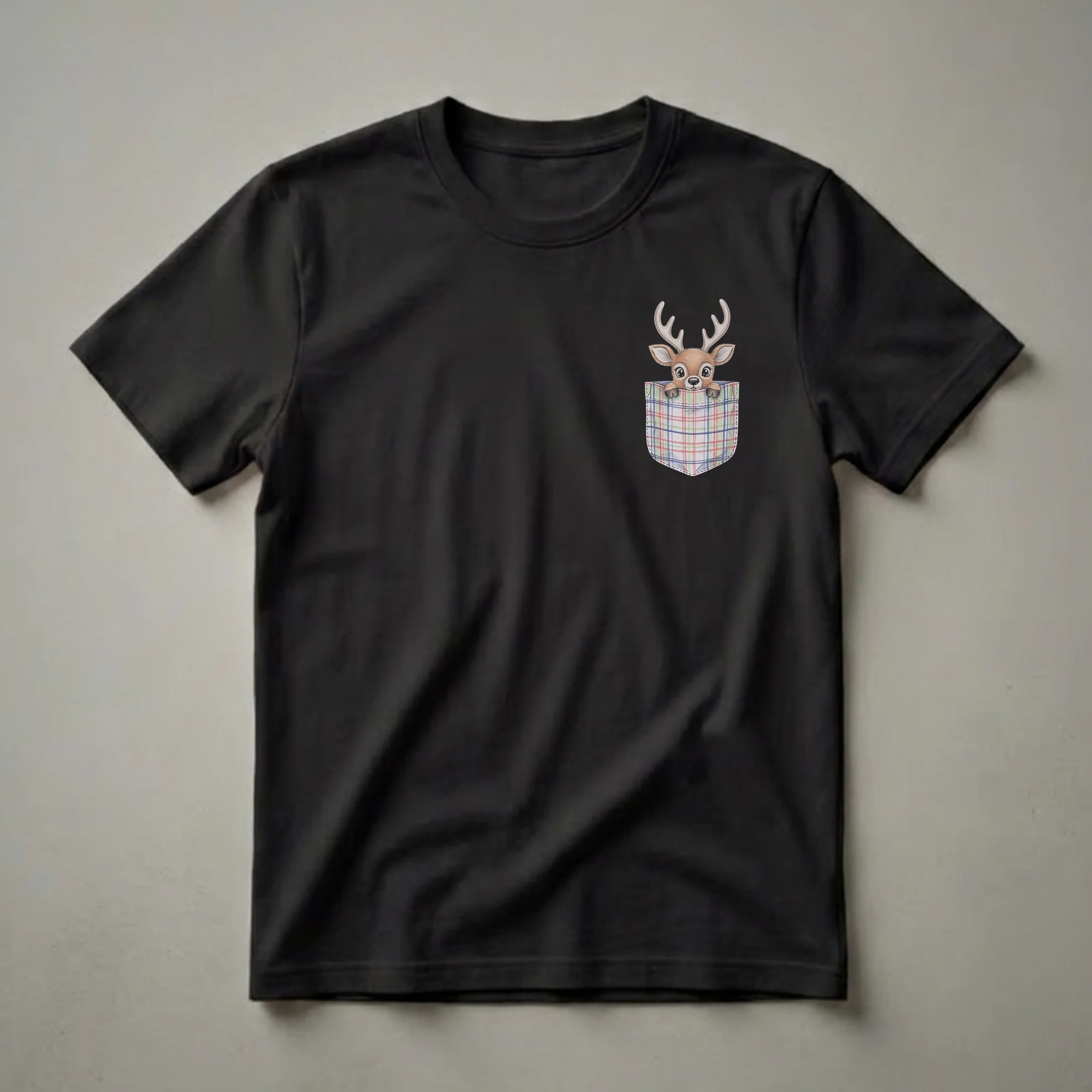 Families looking to coordinate their holiday outfits will adore this charming Christmas tee. The design features a sweet, cartoon-style reindeer peeking out from a plaid pocket. The pocket itself is rendered in a classic red, green, and blue plaid pattern, evoking a cozy, traditional holiday feel. Reindeer are iconic symbols of winter and Christmas, often associated with Santa's sleigh and the festive season. This graphic t-shirt is a delightful way for parents, children, and even extended family members to show their festive spirit. Imagine the joy of seeing everyone in the family sporting this eye-catching design during holiday gatherings, Christmas morning, or festive outings. It makes a thoughtful gift for any family member who enjoys celebrating the holidays in style. This shirt is a go-to tee for creating lasting Christmas memories and capturing adorable family photos. Wear it to holiday parties, while decorating the tree, or on Christmas morning for a touch of whimsical holiday cheer.