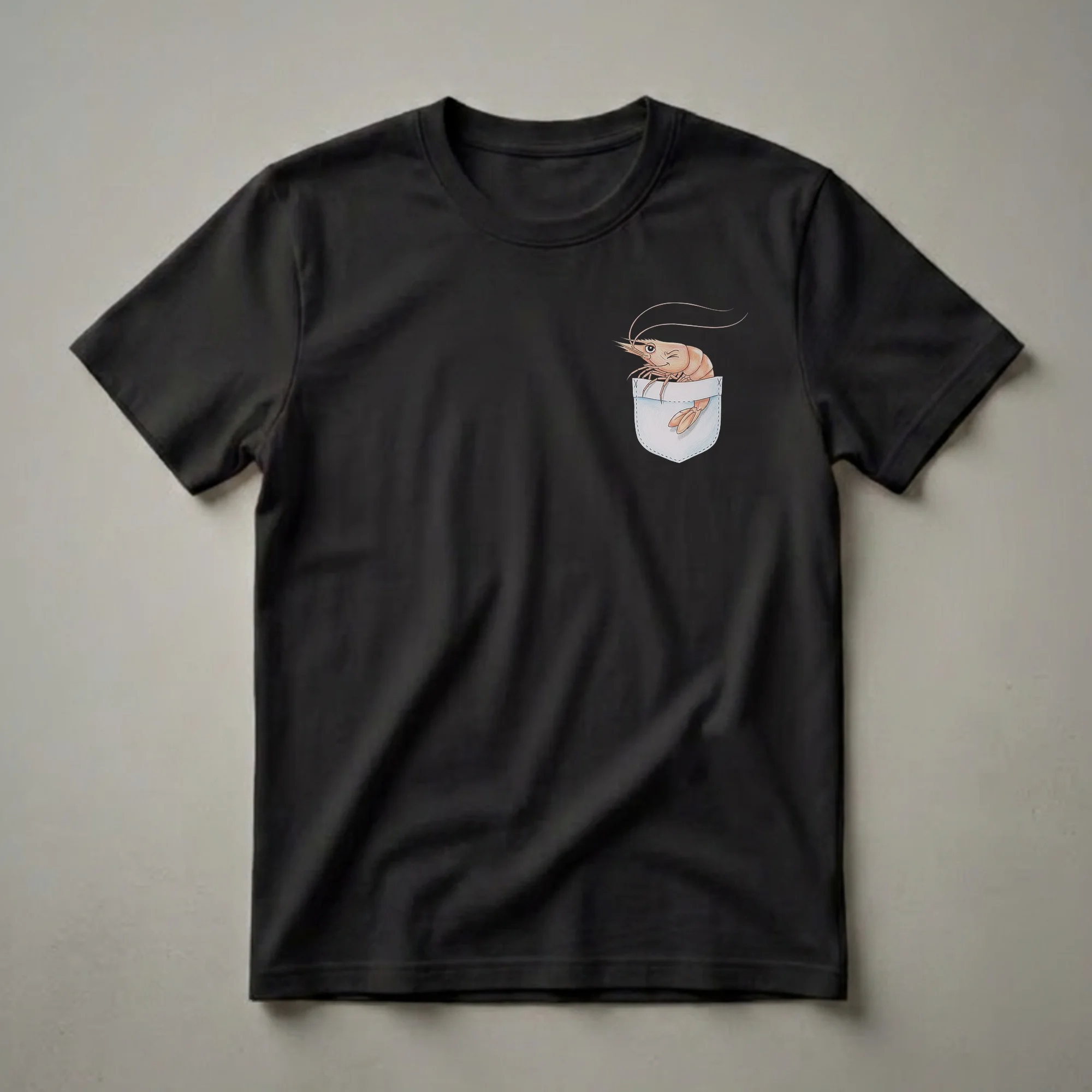 Marine life enthusiasts will appreciate this charming t-shirt featuring a whimsical drawing of a shrimp peeking out of a pocket. The artwork, rendered in a watercolor style, captures the playful nature of these crustaceans. Shrimp are decapod crustaceans with elongated bodies and a distinctive exoskeleton, commonly found in marine environments worldwide. They play a crucial role in aquatic ecosystems, serving as a food source for many larger animals and contributing to nutrient cycling. This eye-catching graphic tee is a fantastic way for anyone who loves the ocean, seafood, or unique art to express their personality. It makes a thoughtful gift for birthdays, holidays, or just because for the shrimp lover in your life. Wear this unique shirt to casual outings, beach trips, or anywhere you want to spark a conversation about marine wonders. This t-shirt is a staple for anyone with an appreciation for the underwater world and its fascinating inhabitants.