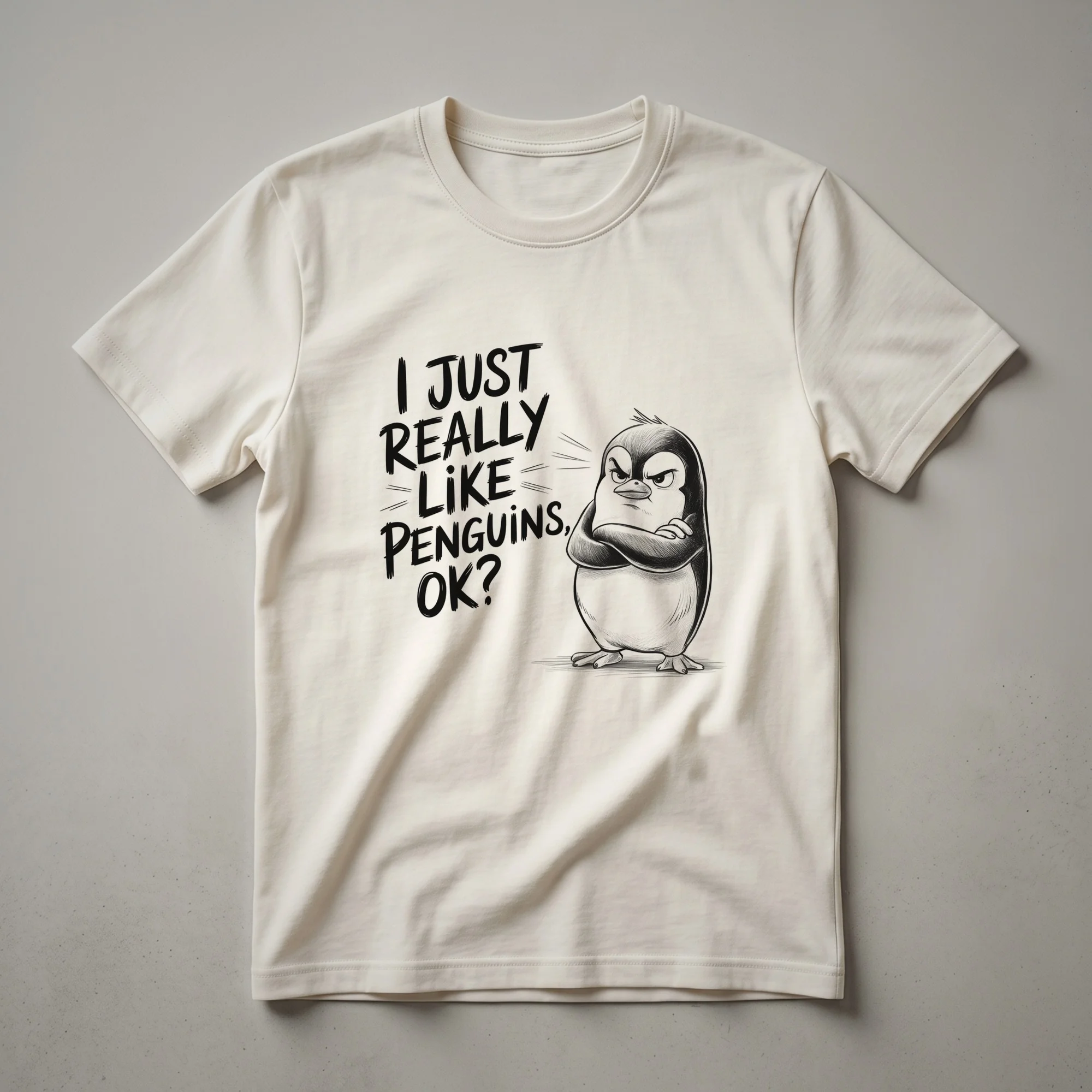 Penguin lovers who appreciate the unique charm of these flightless birds will reach for this distinctive graphic tee. The design features a distressed, vintage-inspired illustration of a penguin, evoking a sense of nostalgia and timeless appeal. Surrounding the central image is the playful declaration, "I Just Really Like Penguins, Ok?", making it clear that this shirt is for true aficionados. Penguins are fascinating creatures, known for their distinctive waddle and their ability to thrive in some of the planet's harshest environments, from the icy shores of Antarctica to the warmer coasts of South America and Africa. This t-shirt serves as a conversation starter, connecting you with fellow penguin enthusiasts. It makes a thoughtful gift for anyone who adores these captivating birds, whether they are a dedicated ornithologist, a casual admirer, or someone who simply finds joy in their charming presence. Wear this comfortable tee to casual outings, nature walks, or while simply relaxing at home, celebrating your passion for penguins.