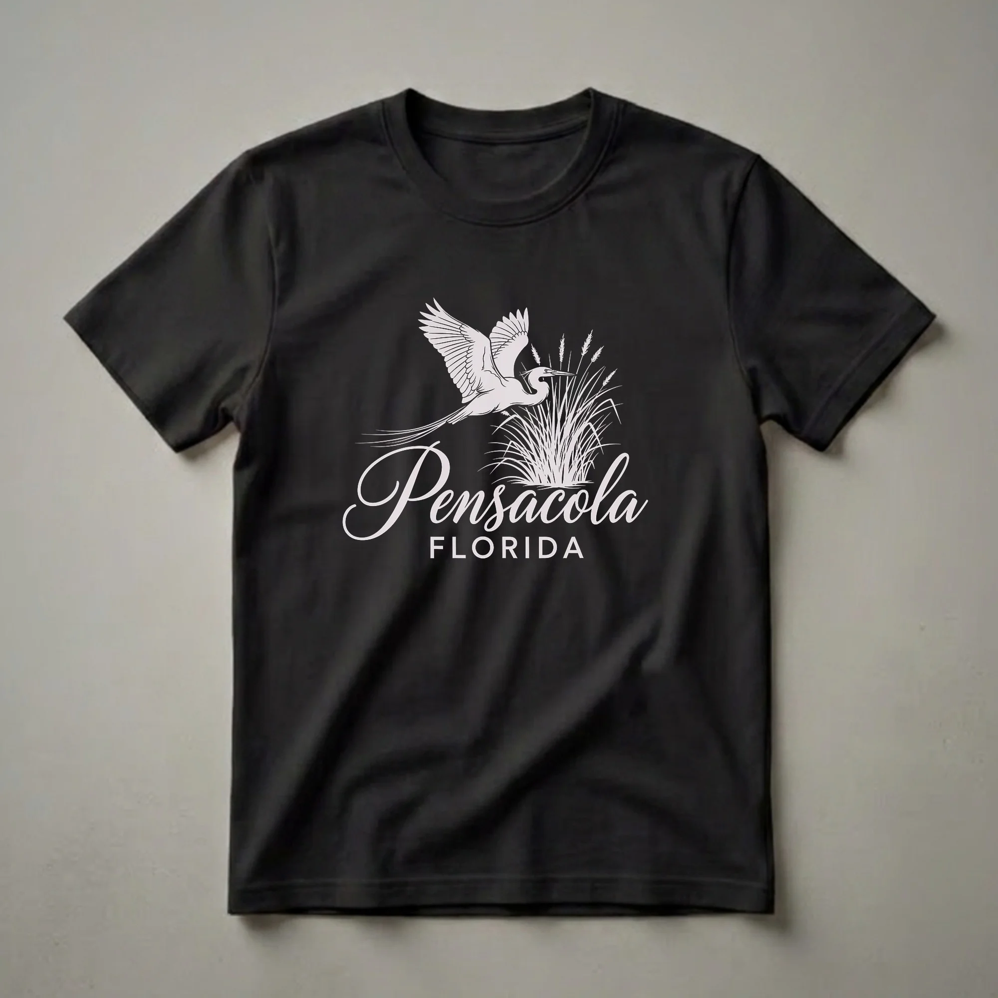 Pensacola, Florida, a city rich in history and natural beauty, is celebrated on this unique graphic tee. The design features a striking white egret in mid-flight, its wings spread wide, soaring above a cluster of tall, elegant reeds. This imagery evokes the serene coastal wetlands and abundant wildlife found in the Pensacola area, particularly along its famous white-sand beaches and bayous. Pensacola, known as the "City of Five Flags," boasts a vibrant culture and a significant naval presence, making it a destination for history buffs and beach lovers. This shirt is a thoughtful gift for anyone who has visited or lives in Pensacola, or for those who appreciate the natural splendor of the Florida Panhandle. It's a comfortable and stylish way to wear your connection to this beautiful Gulf Coast city. Whether you're a local proud of your hometown or a visitor cherishing memories, this t-shirt serves as a wearable memento of Pensacola's charm. Wear it to the beach, to a casual outing, or while exploring the historic downtown district.