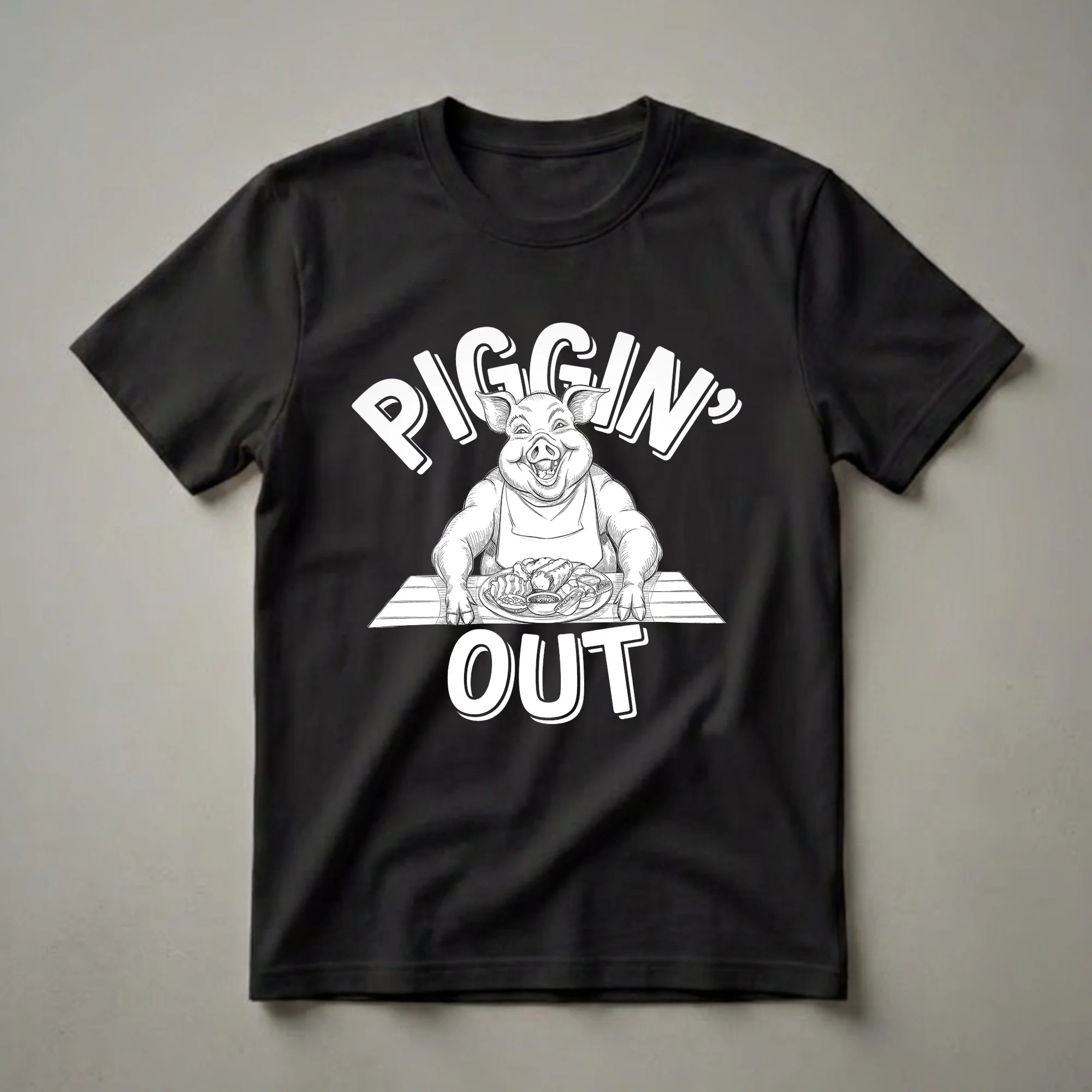 Food lovers and barbecue enthusiasts will reach for this humorous graphic tee featuring a smiling pig ready to indulge. The design showcases a cartoon pig, complete with an apron, seated at a table with a heaping plate of food. Bold white lettering reads 'PIGGIN' OUT' above and below the illustration, emphasizing the theme of hearty eating. This shirt is a playful nod to the enjoyment of a substantial meal, whether it's a backyard cookout or a favorite restaurant. Pigs are known for their omnivorous diet and their association with delicious pork dishes, making this design a fitting tribute for those who appreciate good food. This t-shirt makes a thoughtful gift for the foodie in your life, the grill master, or anyone who enjoys a good laugh and a great meal. Wear it to your next barbecue, a casual get-together, or simply when you want to express your passion for food with a touch of humor. It's a staple in any collection for those who believe that life is too short to not enjoy every bite.