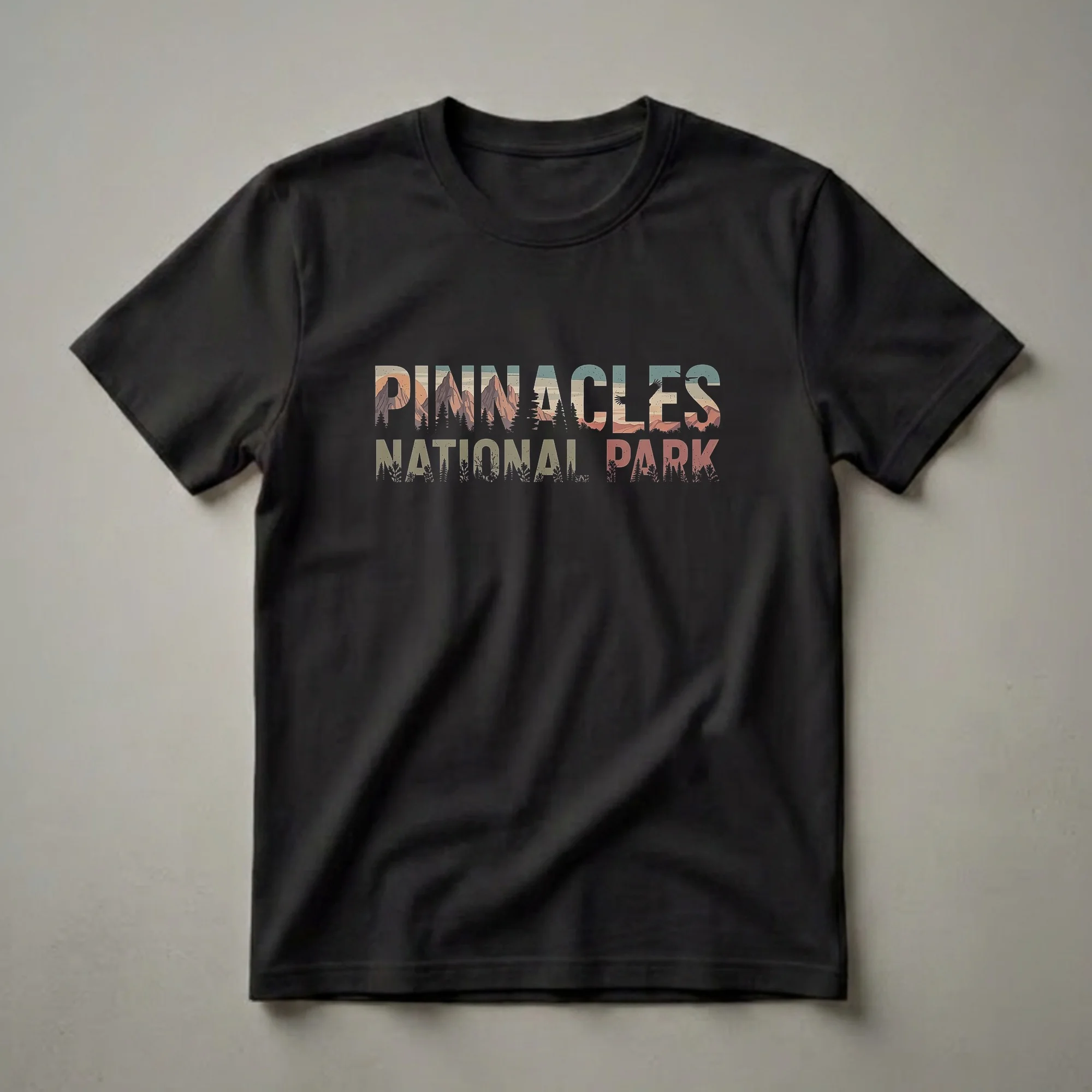 Pinnacles National Park owners and visitors who appreciate the unique geological formations and diverse wildlife will reach for this tee. Pinnacles National Park, located in central California, is renowned for its towering rock spires, talus caves, and the California condor. This striking graphic t-shirt captures the essence of the park with a retro-inspired design. The words 'PINNACLES NATIONAL PARK' are filled with a scenic landscape, depicting rugged mountains bathed in the warm glow of a setting sun, silhouetted pine trees, and soaring birds. This shirt is a thoughtful gift for any hiker, camper, or outdoor enthusiast who has explored or dreams of exploring this natural wonder. Wear it on your next adventure to Pinnacles or as a reminder of your favorite national park. This apparel is a staple for anyone who loves the great outdoors and iconic American landscapes. It makes a thoughtful gift for friends and family who share a passion for national parks and scenic beauty.