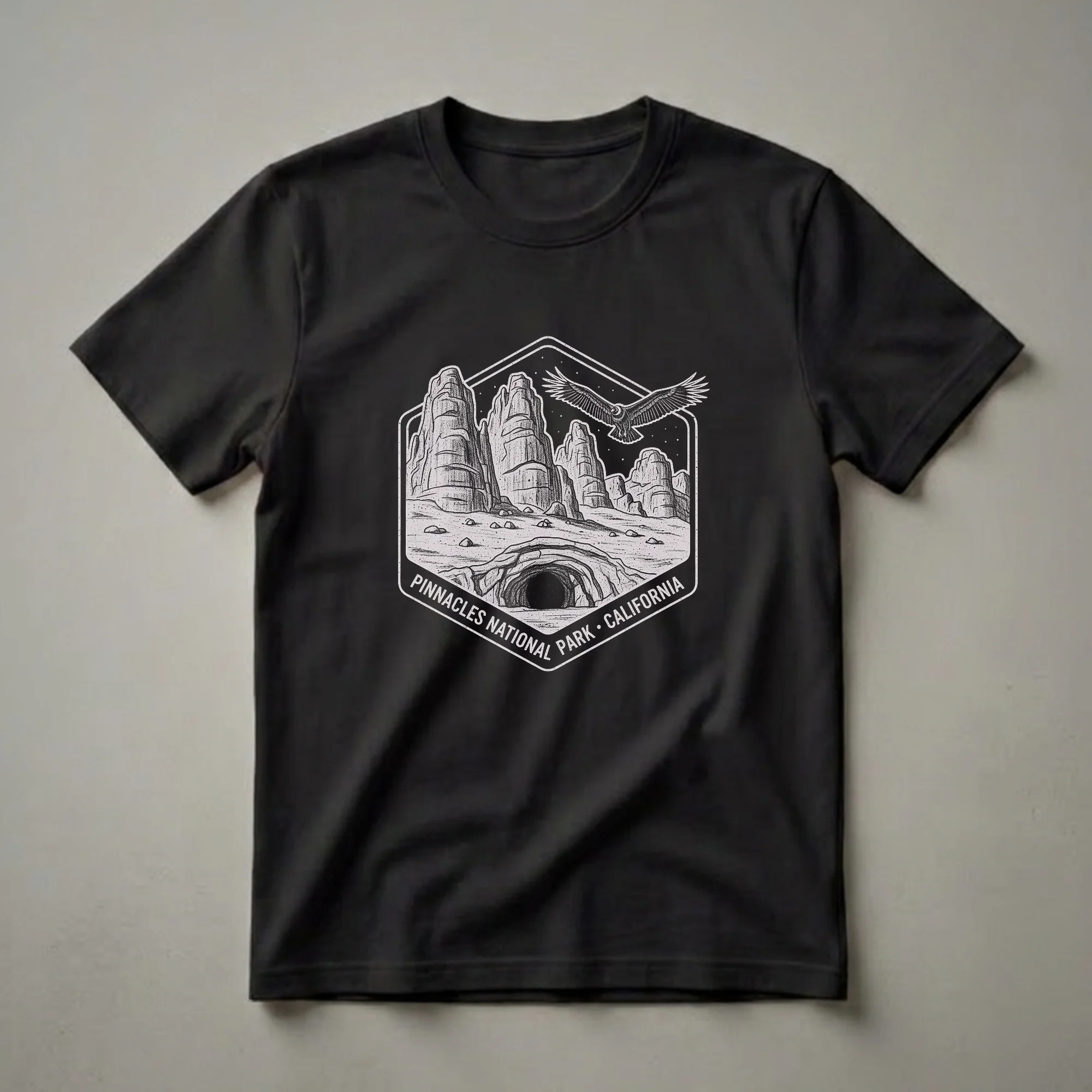 Outdoor enthusiasts and park visitors will appreciate this graphic tee showcasing the unique landscape of Pinnacles National Park in California. The design features a hexagonal badge with a vintage, etched style, depicting towering rock spires and a prominent cave entrance in the foreground. A majestic bird, likely a California Condor, soars across the starry night sky above the formations. Pinnacles National Park is renowned for its dramatic rock formations, remnants of an ancient volcanic landscape, and its extensive cave systems, including Bear Gulch Cave and Balconies Cave, which are popular hiking destinations. This shirt is a thoughtful gift for anyone who has visited or dreams of exploring this geological wonderland. It's a great way to commemorate a trip or simply express a love for the outdoors and the natural beauty of California's parks. Wear this comfortable tee on your next hike, camping trip, or casual outing to show your appreciation for this remarkable national park.