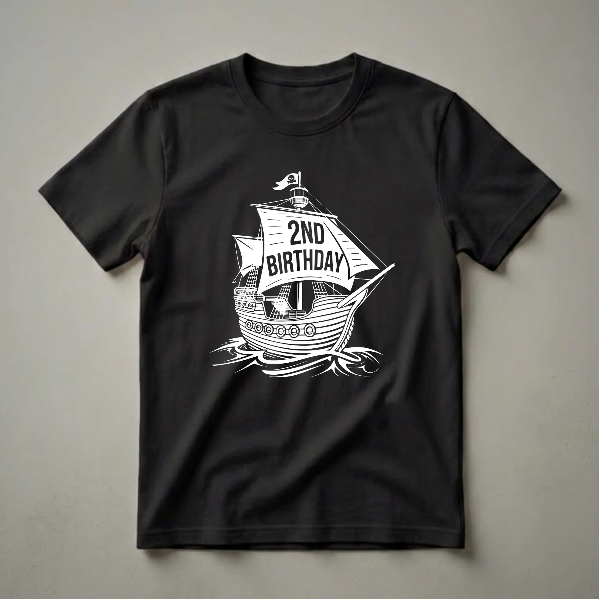 Two-year-olds are embarking on their own grand adventures, and this pirate ship tee is ready to set sail with them. The graphic features a classic pirate ship with billowing sails, complete with a skull and crossbones flag flying high from the crow's nest. Stylized waves crash around the hull, giving the impression of a ship sailing the high seas. The sails proudly display the words '2ND BIRTHDAY' in bold lettering, making it clear this shirt is for a special milestone. This t-shirt is a thoughtful gift for any child turning two who loves pirates, ships, or the thrill of exploration. Imagine the birthday boy or girl wearing this shirt to their pirate-themed party or on a special outing. It’s a fun way for them to celebrate this significant age, marking their journey into toddlerhood. This apparel is designed to bring a smile to the birthday child and make their second birthday celebration even more memorable. It’s a go-to tee for any little buccaneer ready for adventure.
