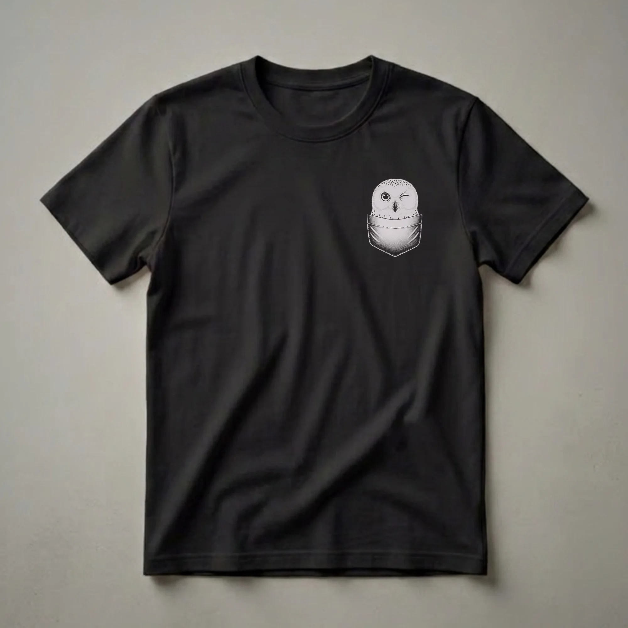 Owl fans and birdwatchers who love a design with personality will reach for this graphic tee. The design places a small pencil-sketch drawing of a Snowy Owl in the upper right chest area, the bird's round head peeking out of a faux stitched pocket. The owl's head is detailed in soft pencil strokes, white feathers with light grey speckle markings, a small curved beak, large round eye sockets, with one eye open and one in a subtle wink, giving the bird an expression of quiet mischief. The pocket itself is drawn with simple stitch detail, creating the illusion that the owl has settled into the shirt itself. The Snowy Owl (Bubo scandiacus) is one of the largest owl species in the world and the only one with predominantly white plumage. It breeds on the open Arctic tundra across the Northern Hemisphere, nesting directly on the ground in elevated spots with wide sightlines. Every few years, food scarcity in the Arctic drives Snowy Owls south in what ornithologists call irruption years, bringing them to farmland, airports, and coastal dunes across the northern United States and southern Canada in unusually high numbers, events that draw birdwatchers from hundreds of miles away. This shirt makes a thoughtful gift for birdwatchers who have seen a Snowy Owl in the wild, owl enthusiasts, wildlife illustrators, and anyone who loves a pocket print design with a real animal subject. Wear it to a nature walk, a birdwatching outing, a casual day at the market, or any occasion that calls for a shirt with quiet, understated charm.