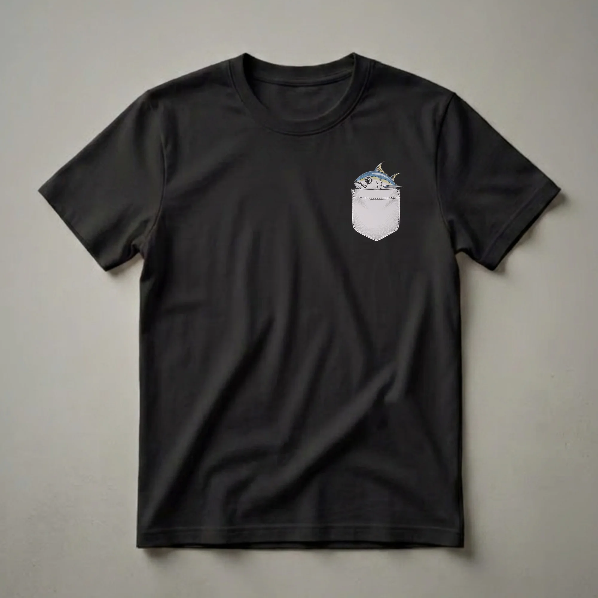 - Features a detailed illustration of a tuna peeking from a faux pocket.