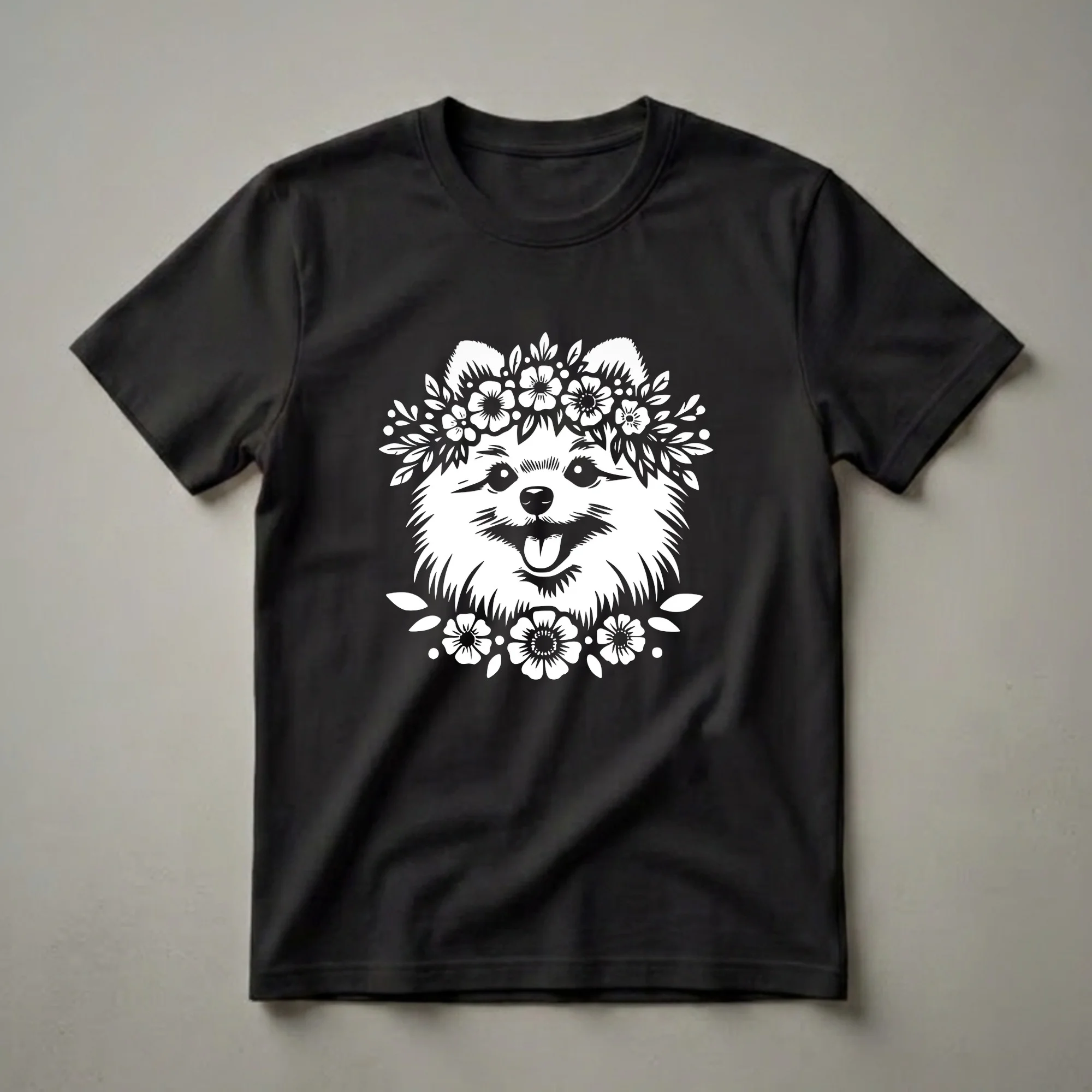 Show off your love for your fluffy Pomeranian with this heart-warming graphic featuring a regal pup adorned in a beautiful floral crown. This eye-catching graphic tee features a charming illustration of a Pomeranian dog, complete with a festive floral crown and a scattering of delicate flowers. The design captures the breed's cheerful disposition, with its tongue playfully peeking out. Pomeranians, originating from the Pomerania region of Central Europe, are known for their intelligence and eagerness to please. This t-shirt is a wonderful way for any Pomeranian owner to express their affection for their furry friend. It makes a thoughtful gift for birthdays, holidays, or just because. Wear this shirt to your next dog park visit, a casual brunch, or while relaxing at home with your beloved pet. This comfortable tee is a staple in the collection for any devoted dog mom.