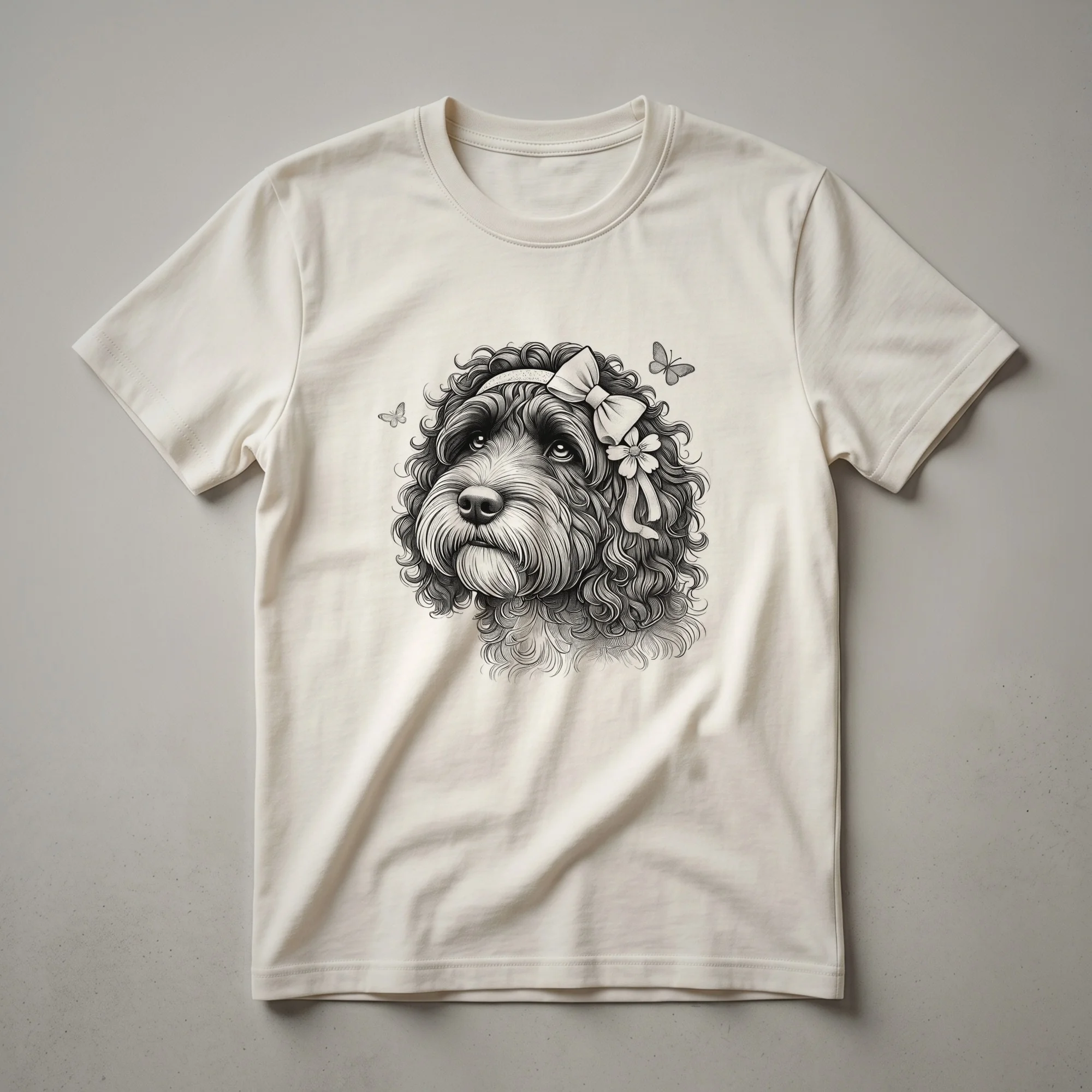 - Portuguese Water Dog mom tee featuring a stylized floral dog face design.