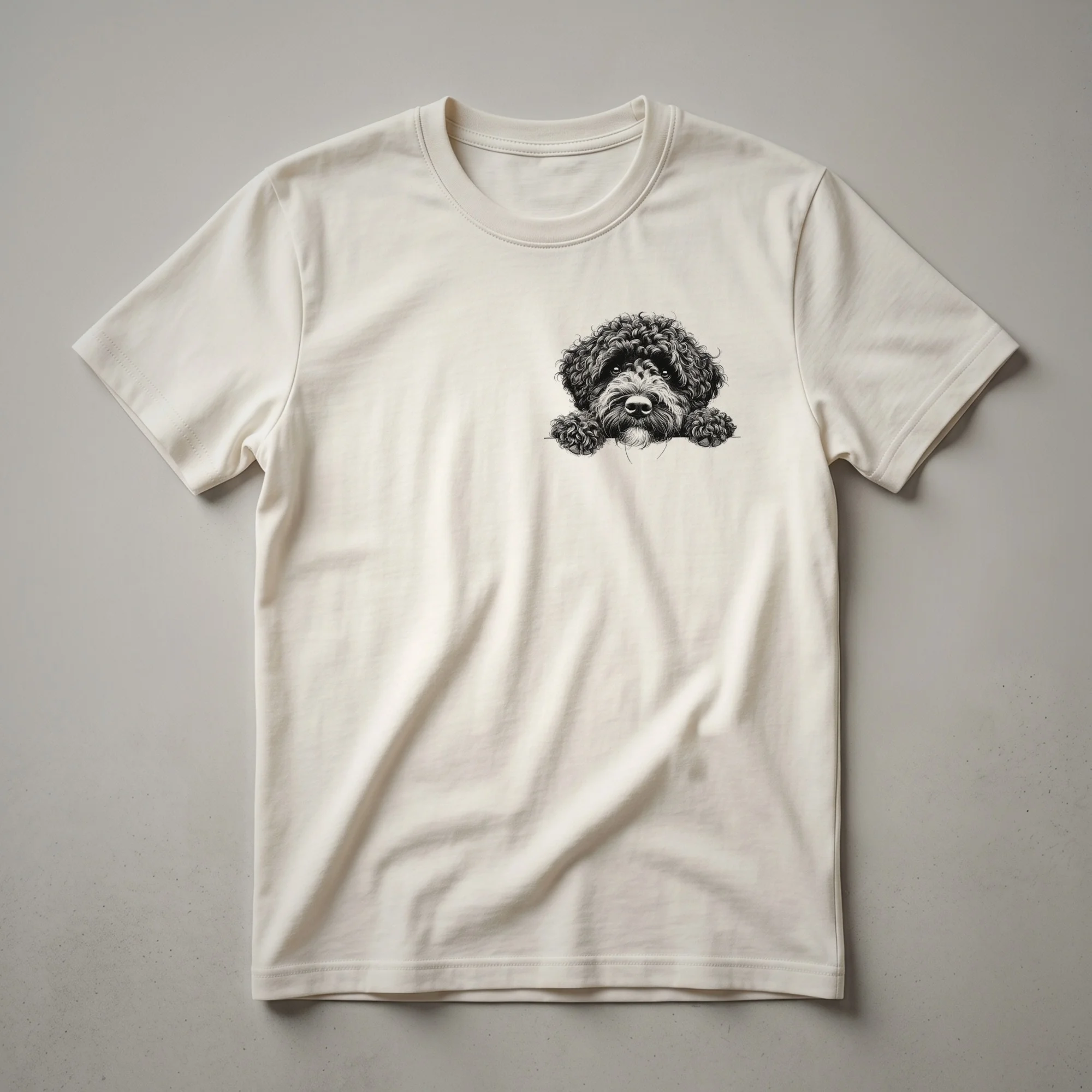 Portuguese Water Dog owners know the breed's intelligence and energetic nature, often associated with their historical role as fishermen's helpers. This graphic tee captures that playful spirit with a charming illustration of a Portuguese Water Dog peeking from the bottom of the shirt. The design features a black and white depiction of the dog, highlighting its distinctive curly or wavy coat and alert expression. This t-shirt is a fantastic way for any dog mom or dog dad to express their affection for their furry companion. It's a staple in the collection for those who appreciate the unique personality of this breed. Imagine wearing this shirt to your local dog park or on a casual outing, sparking conversations with fellow dog enthusiasts. It makes a thoughtful gift for birthdays, holidays, or just because, for anyone who cherishes their Portuguese Water Dog. This comfortable tee is a go-to for everyday wear, allowing you to carry a piece of your beloved pet with you wherever you go.