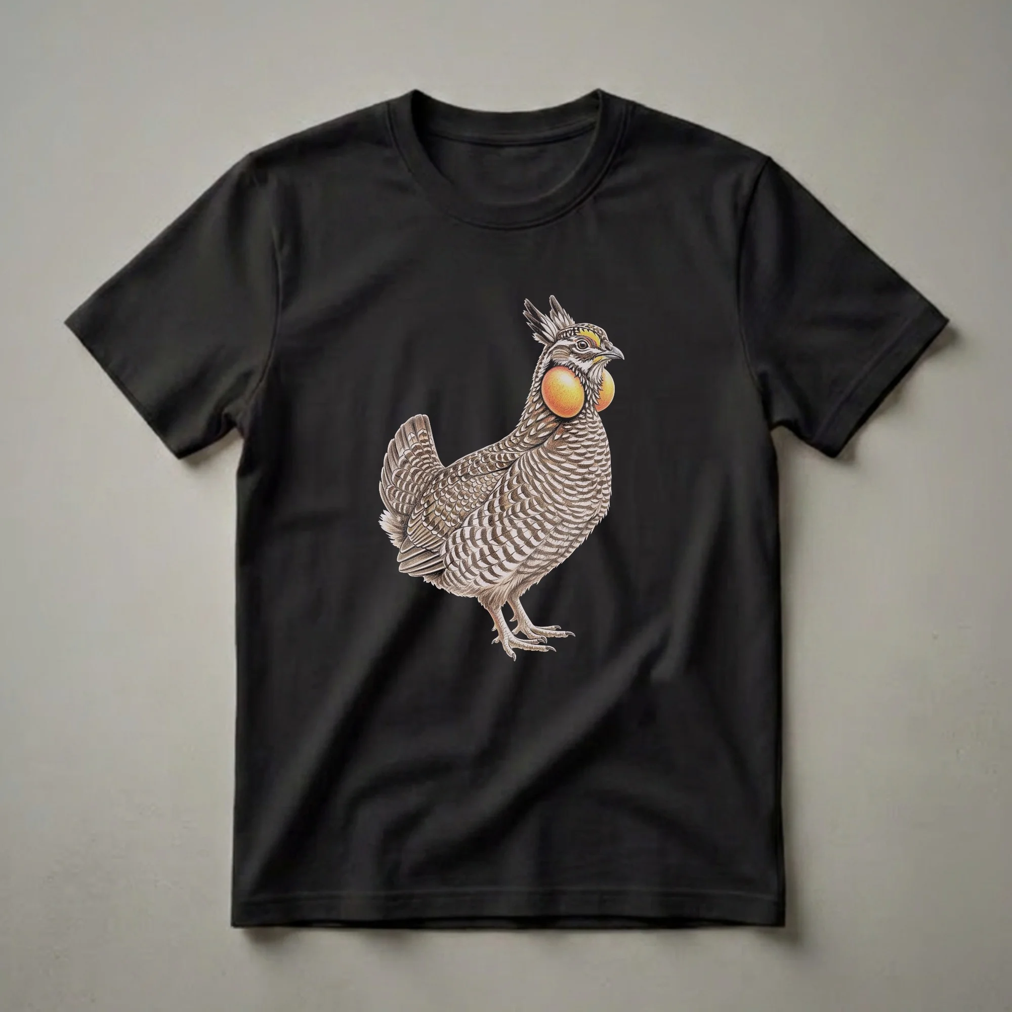 Prairie chicken enthusiasts will appreciate the intricate detail in this vintage-style drawing of the iconic bird. The artwork captures a male prairie chicken in full display, with its vibrant yellow-orange neck sacs inflated, a characteristic behavior during mating rituals. This striking graphic tee features a realistic rendering, showcasing the bird's patterned plumage and distinctive crest. Prairie chickens are ground-dwelling birds native to North America, known for their elaborate courtship dances on leks. This shirt is a thoughtful gift for bird watchers, ornithologists, or anyone who admires the unique wildlife of the grasslands. Wear this tee to your next birding expedition or casual outing to spark conversations about these fascinating fowl. It's a staple in the collection for those who cherish the natural world and its inhabitants. This t-shirt celebrates the beauty of these grassland dwellers.