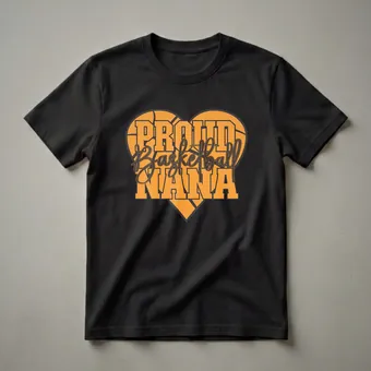- This graphic tee features bold orange lettering within a heart shape, celebrating the 'Proud Basketball Nana' title.