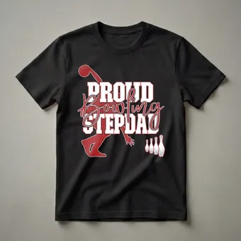 - Showcases a proud stepdad's support for family bowling with a dynamic bowler graphic.