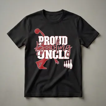 Bowling uncles who want to showcase their family pride will reach for this striking graphic tee. The design features a dynamic illustration of a bowler in the motion of releasing the ball, set against a backdrop of bowling pins. Bold, collegiate-style lettering spells out "PROUD BOWLING UNCLE," emphasizing the wearer's supportive role. This shirt is a fantastic way for any uncle to celebrate their connection to the sport and their family's passion for bowling. Whether attending league nights, cheering from the sidelines, or participating in casual games, this apparel makes a statement. It's a thoughtful gift for the uncle who always shows up to support their nieces and nephews on the lanes, making them feel celebrated and appreciated. This tee works well for casual outings, family gatherings, or even as comfortable loungewear for the dedicated bowling enthusiast. Embrace your title and let everyone know you're the proudest bowling uncle out there with this unique t-shirt.