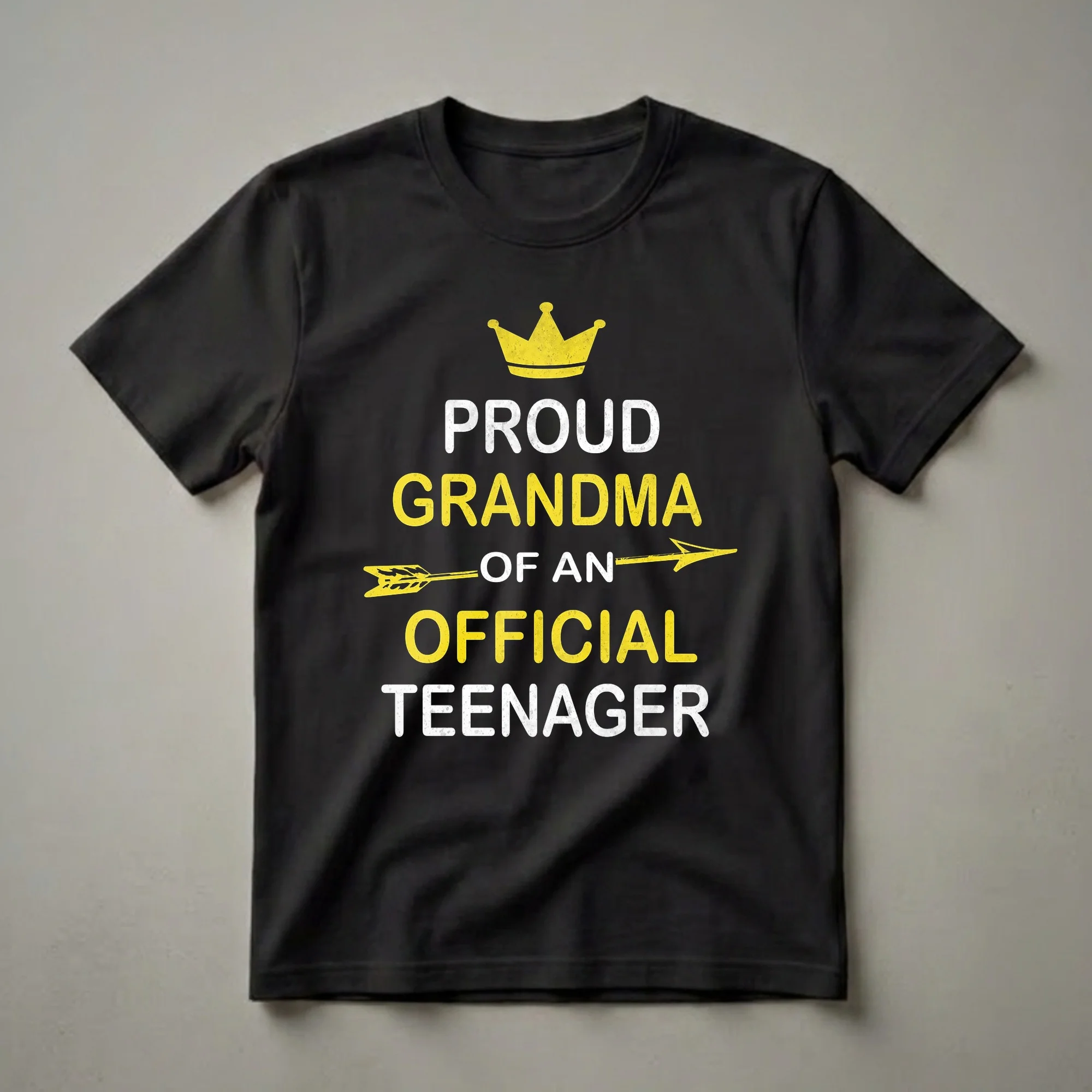 - Features 'Proud Grandma of an Official Teenager' text with crown and arrow graphics.
