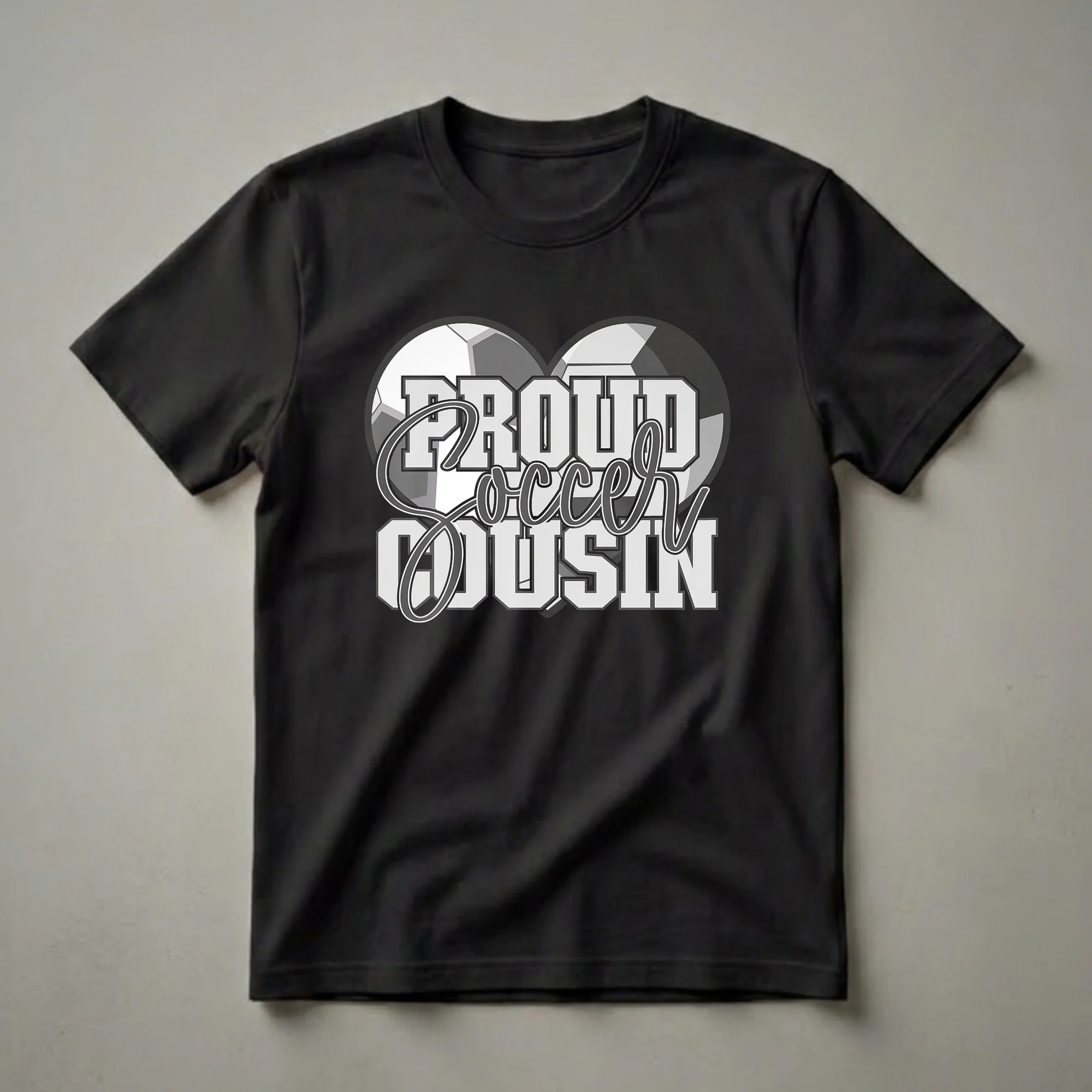 - Features a heart shape formed by two soccer balls and bold "PROUD SOCCER COUSIN" text.