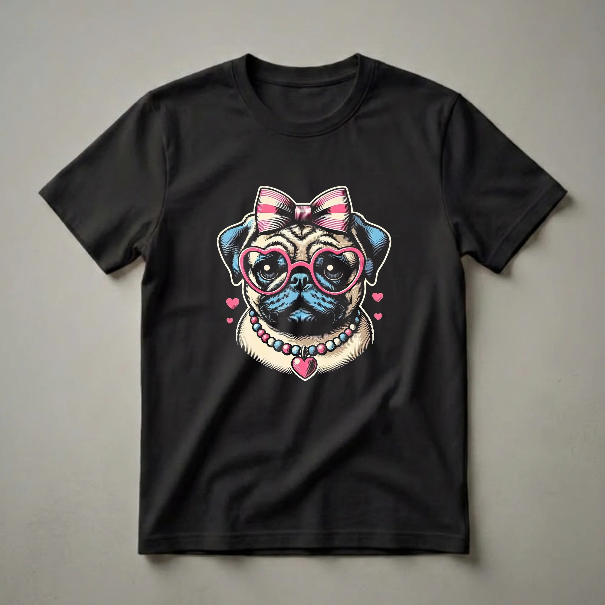 - Features a stylish pug illustration with heart glasses and a bow.