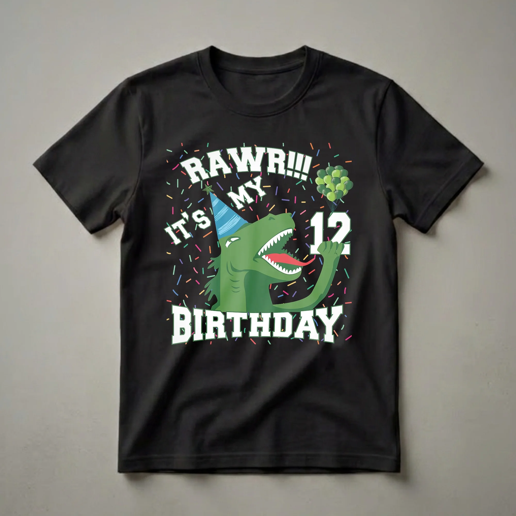 Turning twelve is a monumental milestone, marking the transition into the teen years, and this T-Rex birthday tee is here to help celebrate that roaring occasion. The graphic showcases a vibrant green T-Rex, complete with a blue party hat adorned with a green star, and its mouth wide open in a joyful roar, revealing sharp teeth and a bright red tongue. Colorful confetti rains down, adding to the festive atmosphere, while a cluster of green balloons floats nearby, symbolizing the excitement of the day. The bold white text, outlined in green, clearly states "RAW R!!! IT'S MY BIRTHDAY" and prominently features the number "12", signifying the age being celebrated. This t-shirt is a fantastic way for any 12-year-old dinosaur enthusiast to express their excitement for their birthday party. It’s a fun and eye-catching shirt that will make the birthday boy or girl feel special. This tee works well for a birthday party, a casual get-together with friends, or even just for everyday wear leading up to the big day. It makes a thoughtful gift for any child who loves dinosaurs and is ready to celebrate their twelfth birthday in prehistoric style. Imagine the smiles when they unwrap this unique birthday apparel, ready to show off their age with a mighty roar.