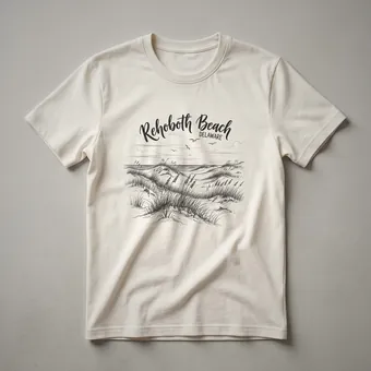 Beach lovers can celebrate the scenic beauty of Rehoboth Beach, Delaware, with this artful t-shirt featuring a captivating sketch of its coastal landscape.This graphic tee captures the serene beauty of its natural landscape with a detailed sketch art design. The artwork showcases rolling dunes covered in wind-swept sea grass, leading down to the gentle waves of the Atlantic Ocean. Above, a few seagulls soar in the sky, adding a touch of coastal life to the scene. The words 'Rehoboth Beach' are elegantly scripted, with 'DELAWARE' subtly placed beneath, grounding the design in its specific location. This t-shirt is a thoughtful gift for anyone who cherishes memories of Rehoboth Beach or dreams of visiting its picturesque coastline. It's a staple in the collection for beach enthusiasts, travelers, and those who appreciate coastal art. Wear this shirt to remember your favorite beach vacation or to bring a piece of the Delaware coast with you wherever you go. It's a unique way to express your love for this charming seaside town and its natural splendor, making it a go-to tee for casual outings or beach-themed events.