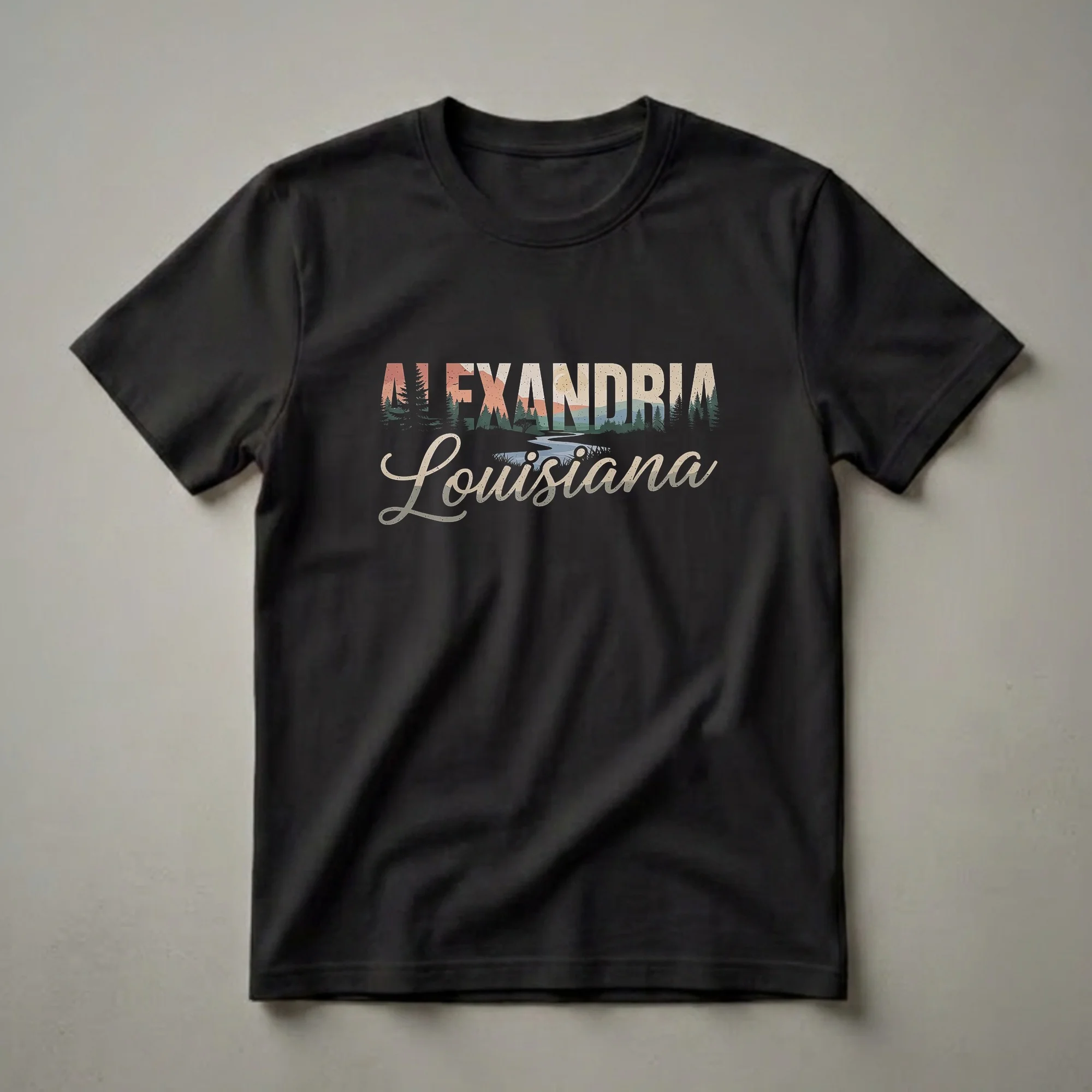 - Alexandria, LA graphic tee featuring a vintage pine forest and winding river.