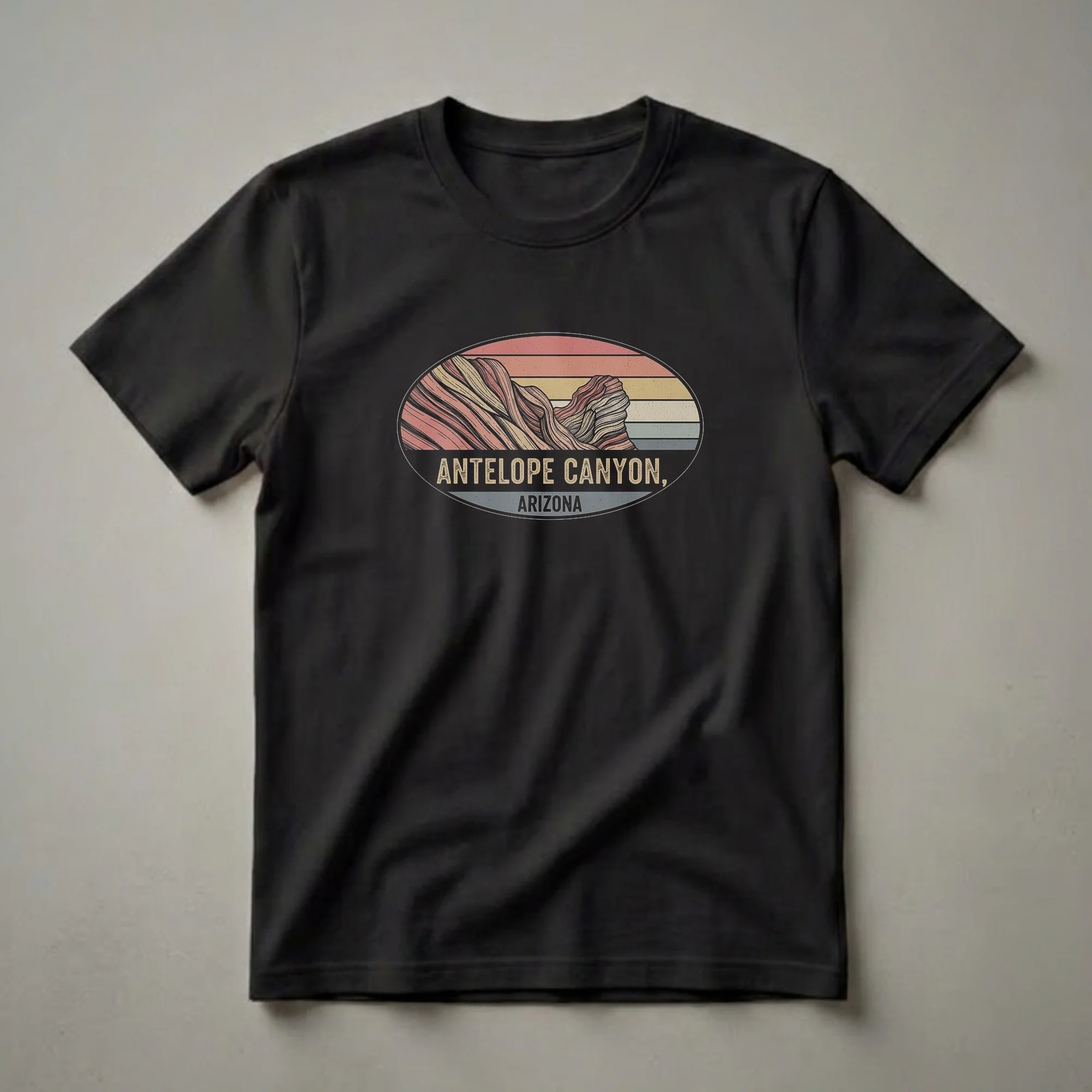 Antelope Canyon, Arizona, is a geological wonder known for its sculpted sandstone walls and the way light filters through its narrow passages. This graphic tee features a retro-style illustration that captures the essence of this iconic Navajo Nation slot canyon. The artwork showcases the wavy, layered rock formations in a vintage color palette of muted reds, oranges, yellows, and blues, reminiscent of a classic sunset over the desert landscape. Below the striking imagery, the text clearly labels the location: 'ANTELOPE CANYON, ARIZONA'. This shirt is a perfect way for travelers to commemorate a visit to Page, Arizona, or for anyone who appreciates the natural beauty of the American Southwest. It serves as a unique souvenir and a stylish way to wear your love for iconic landscapes. This t-shirt makes a thoughtful gift for friends and family planning a trip to the Grand Circle or those who dream of exploring the desert. Wear it on your next adventure or as a reminder of a memorable journey through Arizona's stunning natural wonders.