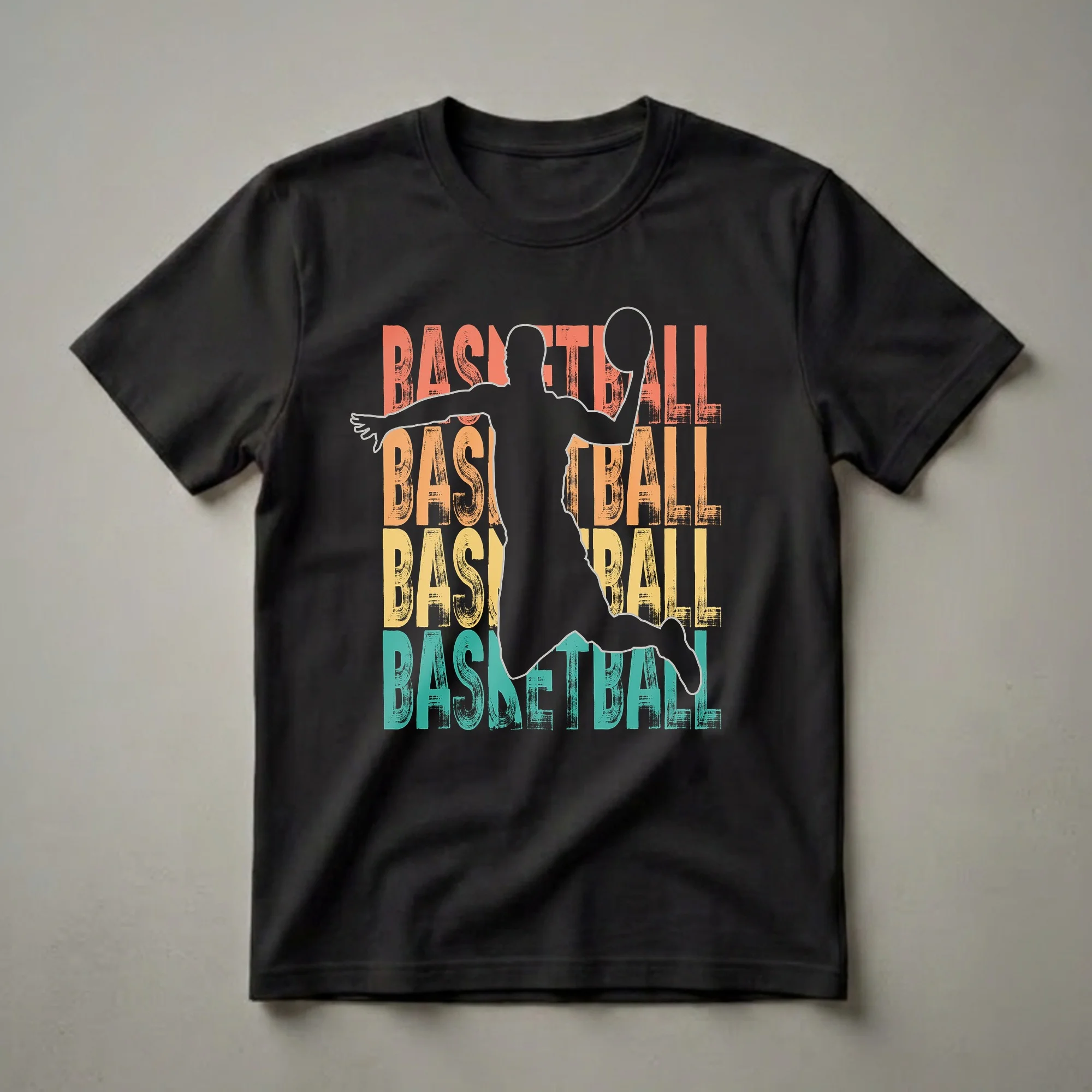Basketball fans who appreciate vintage aesthetics will reach for this eye-catching graphic tee. The design features a bold black silhouette of a player in mid-air, ball in hand, ready to make a play. This dynamic pose is set against a backdrop of repeating, distressed text that spells out 'BASKETBALL' in a retro color palette of coral, yellow, and teal. The word art style evokes a sense of nostalgia, reminiscent of classic sports apparel from the 70s and 80s. This t-shirt is a thoughtful gift for any basketball player, coach, or devoted fan who lives and breathes the sport. It's a staple in the collection for anyone who understands the thrill of a fast break or the satisfaction of a perfectly executed jump shot. Wear it to your next pickup game, to watch a professional match, or simply as a casual statement piece that celebrates your love for the game. The graphic tee is a versatile addition to any wardrobe, well suited for showing team spirit or personal passion.