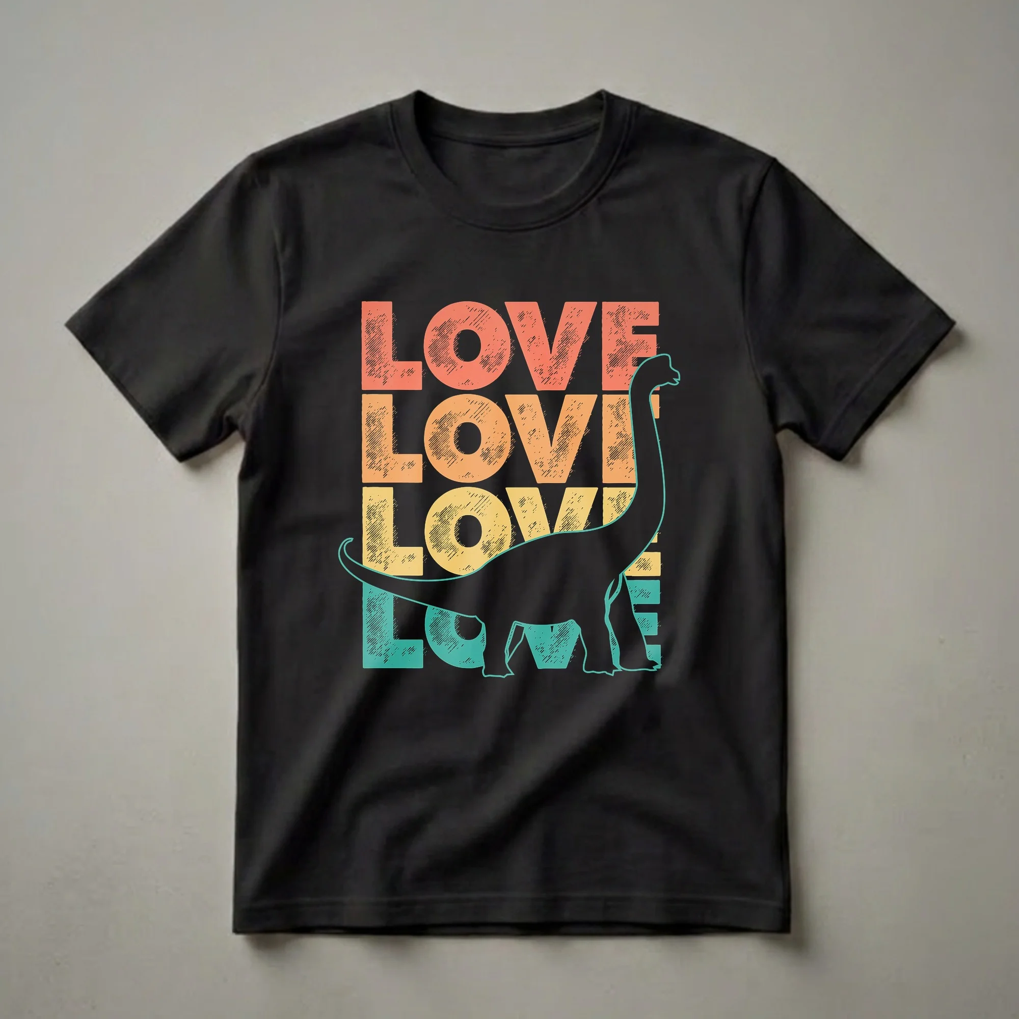 Dinosaur enthusiasts who appreciate the grandeur of prehistoric creatures will reach for this Brachiosaurus graphic tee. The design features the word 'LOVE' stacked vertically in a distressed, retro font, with each letter rendered in a different vibrant color: coral orange, sunny yellow, and teal. Overlaid on this striking text is the silhouette of a Brachiosaurus, a long-necked herbivore that roamed the Earth during the Jurassic period. Brachiosaurus, meaning 'arm lizard,' is known for its exceptionally long forelimbs and its ability to reach high into the treetops for foliage. This shirt is a thoughtful gift for anyone fascinated by paleontology, ancient life, or simply the majestic presence of dinosaurs. It’s a great conversation starter for casual outings, museum visits, or dinosaur-themed events. Wear this unique t-shirt to express your passion for these magnificent ancient reptiles and add a touch of vintage flair to your wardrobe. This apparel is a go-to tee for any dino aficionado.