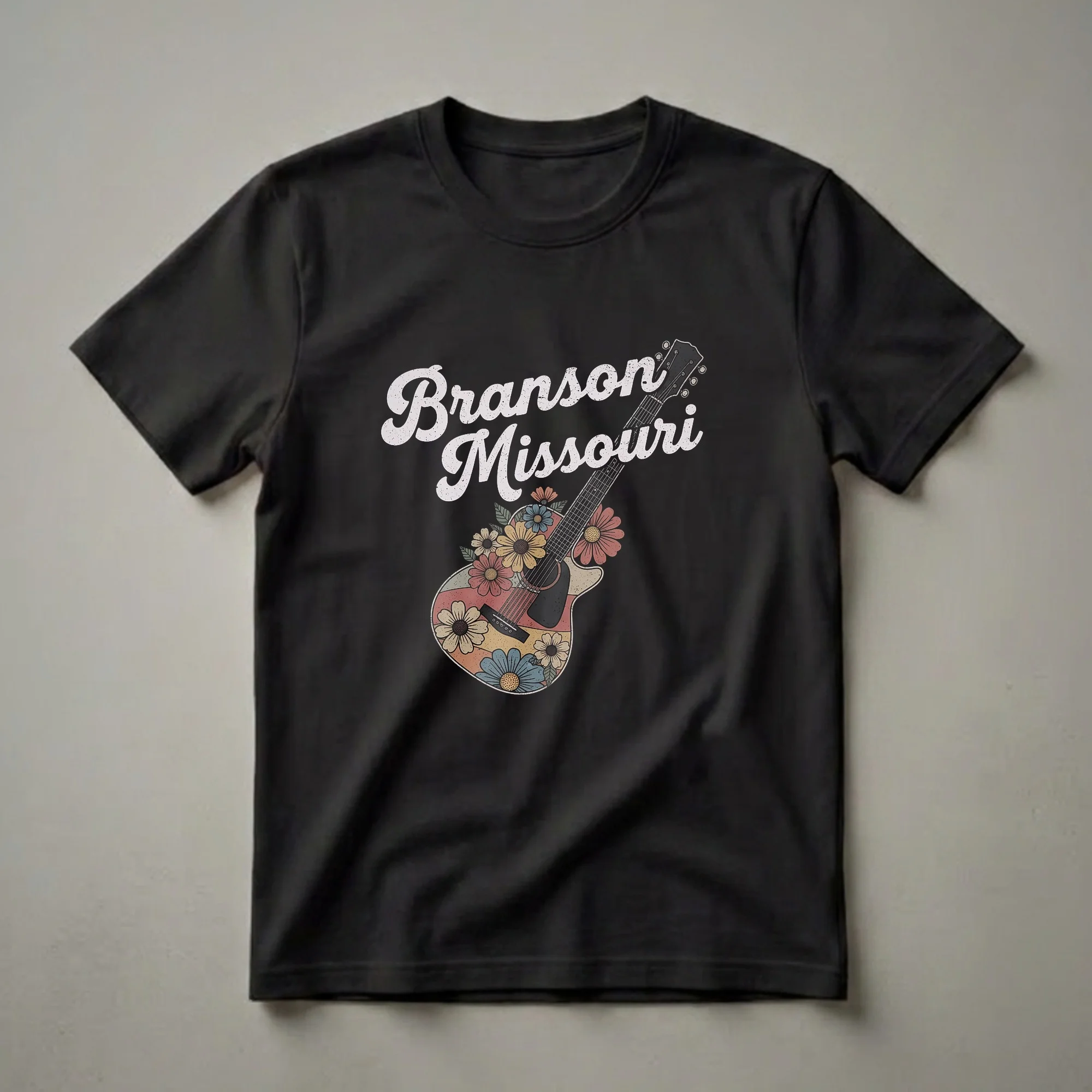 Branson, Missouri, a city known for its live entertainment and music shows, is celebrated in this eye-catching graphic tee. The design features a retro-styled acoustic guitar, its body adorned with a vibrant arrangement of colorful, vintage-inspired flowers. Above the guitar, the words "Branson Missouri" are displayed in a distressed, script font, evoking a nostalgic feel. This shirt is a wonderful way for anyone who has visited or loves the music scene in Branson to express their connection to the city. It's a staple in the collection for fans of live music, country music, and folk performances. This t-shirt works well for casual outings, trips back to Branson, or simply as a conversation starter among fellow music aficionados. It makes a thoughtful gift for friends or family members who have a special place in their heart for this Missouri destination and its rich musical heritage. Wear it to a concert, a local festival, or while exploring the Ozarks.
