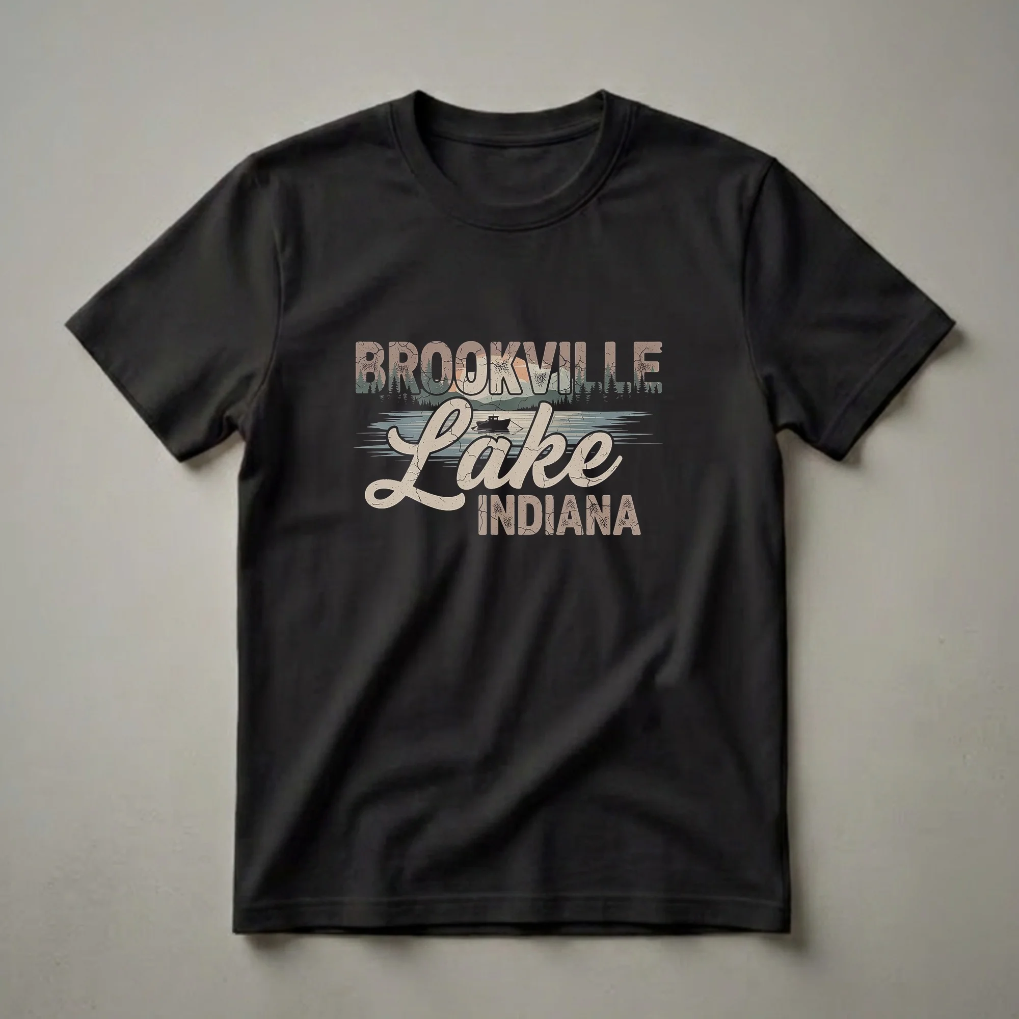 Brookville Lake in Indiana is a popular destination for outdoor enthusiasts, and this graphic tee captures its nostalgic charm. The design features the words "Brookville Lake Indiana" in a distressed, retro font, set against a scenic landscape. A silhouette of pine trees lines the horizon, with a sunset or sunrise peeking through the mountains in the background. Below the text, a serene lake is depicted with gentle waves and a small boat with an oarsman, evoking a sense of peaceful recreation. The cracked, textured effect on the lettering adds to the vintage aesthetic, making this shirt a unique piece of apparel for those who appreciate the natural beauty of the Midwest. This t-shirt is a thoughtful gift for anyone who has visited Brookville Lake, lives in Indiana, or simply enjoys a classic, nature-inspired design. It's a go-to tee for casual outings, fishing trips, or reminiscing about summer days spent by the water. Wear it to your next family gathering or while exploring the Hoosier State to spark conversations about your favorite lake.