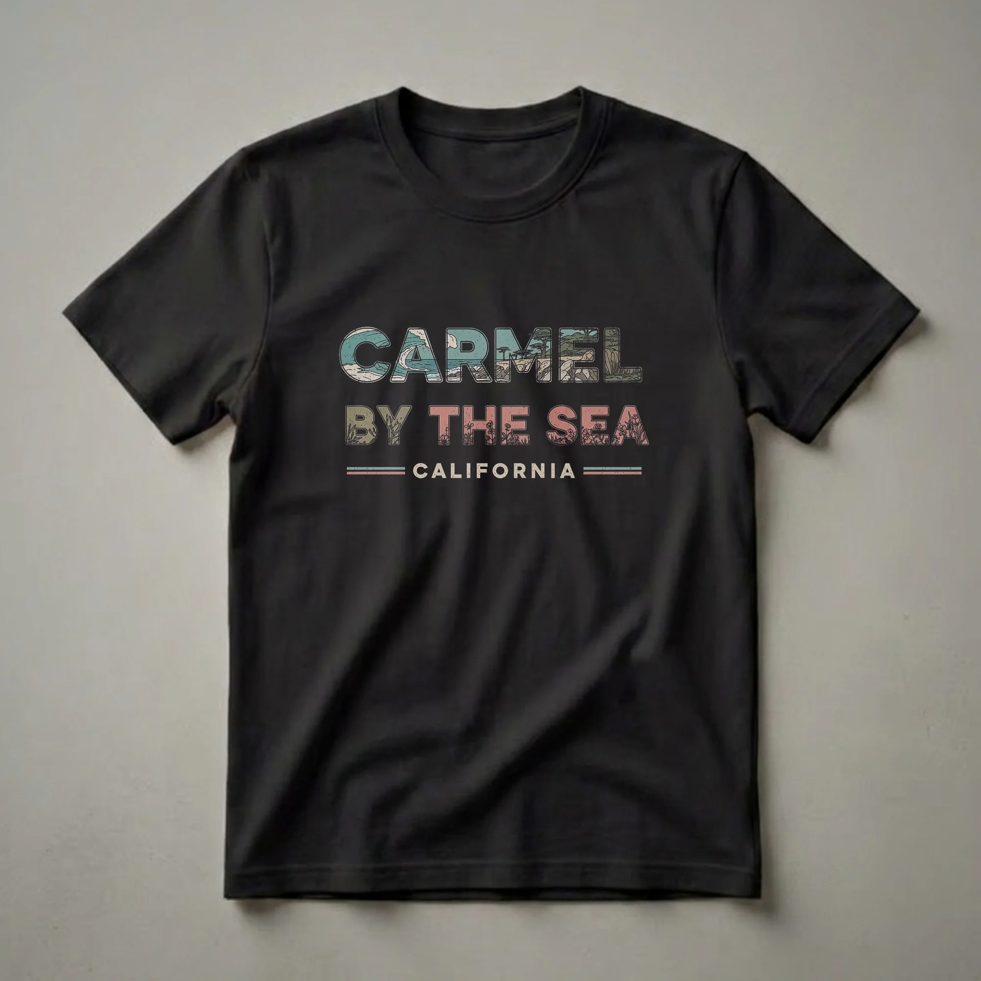 California residents and visitors who cherish the picturesque charm of Carmel by the Sea will appreciate this unique graphic tee. The design boldly spells out "CARMEL BY THE SEA" with "CALIFORNIA" centered below, all rendered in a distinct retro style. Within the letters of "CARMEL," you can see a vibrant coastal scene, complete with rolling waves crashing onto the shore and rugged cliffs dotted with cypress trees, evoking the iconic Monterey Peninsula landscape. The letters of "BY THE SEA" are filled with delicate wildflowers, adding a touch of natural beauty. This t-shirt serves as a wearable memento for anyone who has experienced the artistic and natural allure of this beloved Monterey Bay town. It’s a thoughtful gift for someone planning a trip to the California coast or for a local who wants to display their hometown pride. Wear this shirt to a casual outing, a beach day, or while exploring the charming boutiques and art galleries that Carmel is known for. It’s a staple for any wardrobe celebrating the Golden State's coastal beauty.