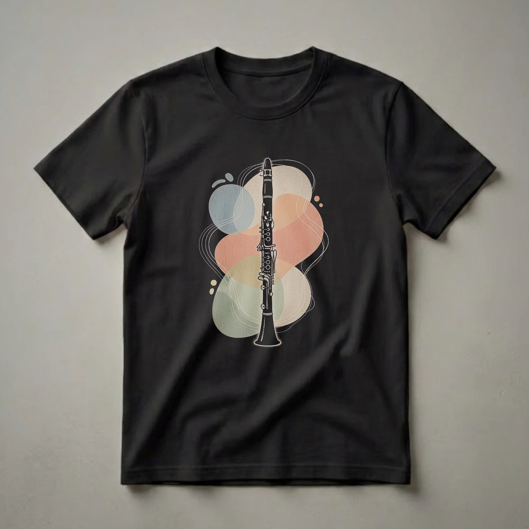 Musicians and music lovers who appreciate the rich tones of woodwind instruments will reach for this striking graphic tee. The design features a detailed silhouette of a clarinet, rendered in a bold black outline against a backdrop of abstract, textured shapes in muted tones of blue, peach, and beige. Delicate white lines swirl around the instrument, adding a dynamic and artistic flair to the composition. The clarinet, a versatile instrument known for its wide range and expressive capabilities, is a staple in orchestras, jazz ensembles, and concert bands. This shirt celebrates the elegance and complexity of this beloved woodwind. It makes a thoughtful gift for any clarinet player, whether they are a student learning their first scales or a seasoned professional performing on stage. This tee is great to wear to band practice, music lessons, concerts, or simply as a stylish everyday statement piece that highlights your musical identity. Embrace your love for the clarinet with this eye-catching apparel.