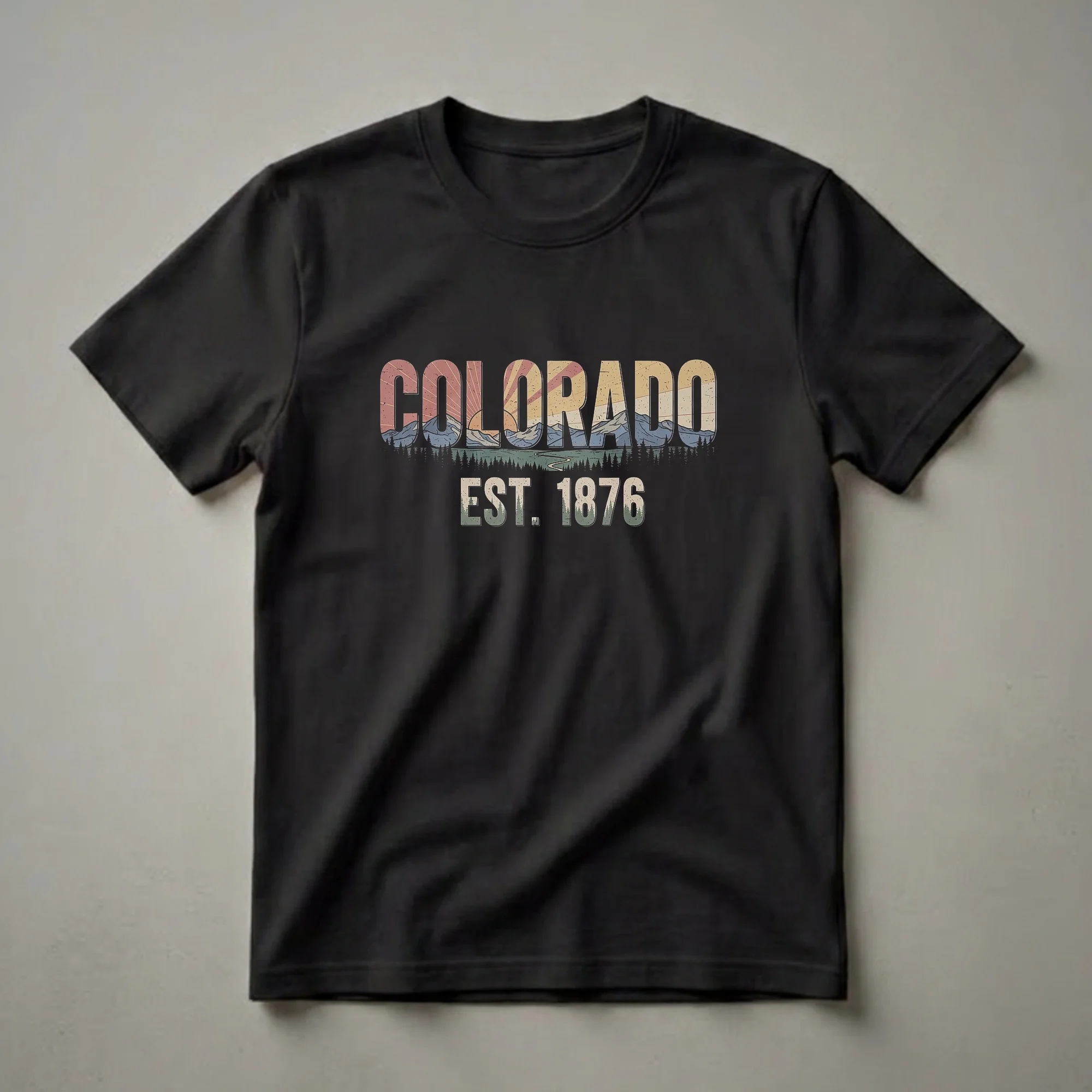 Colorado natives and mountain lovers will reach for this retro graphic tee, showcasing the state's iconic beauty. The word COLORADO is artfully filled with a vintage-style drawing of majestic mountains, a winding river, and a warm sunset, evoking the spirit of the Rocky Mountains. Below, 'EST. 1876' marks the year Colorado became a state, a significant milestone in its history. This t-shirt is a staple for anyone who cherishes the natural splendor and rich heritage of the Centennial State. Wear this shirt to a casual outing, a hike in the mountains, or while reminiscing about your favorite Colorado adventures. It makes a thoughtful gift for friends and family who have a deep connection to Colorado, whether they live there or simply love its breathtaking landscapes. This eye-catching shirt is a great way to express your pride and appreciation for the state.
