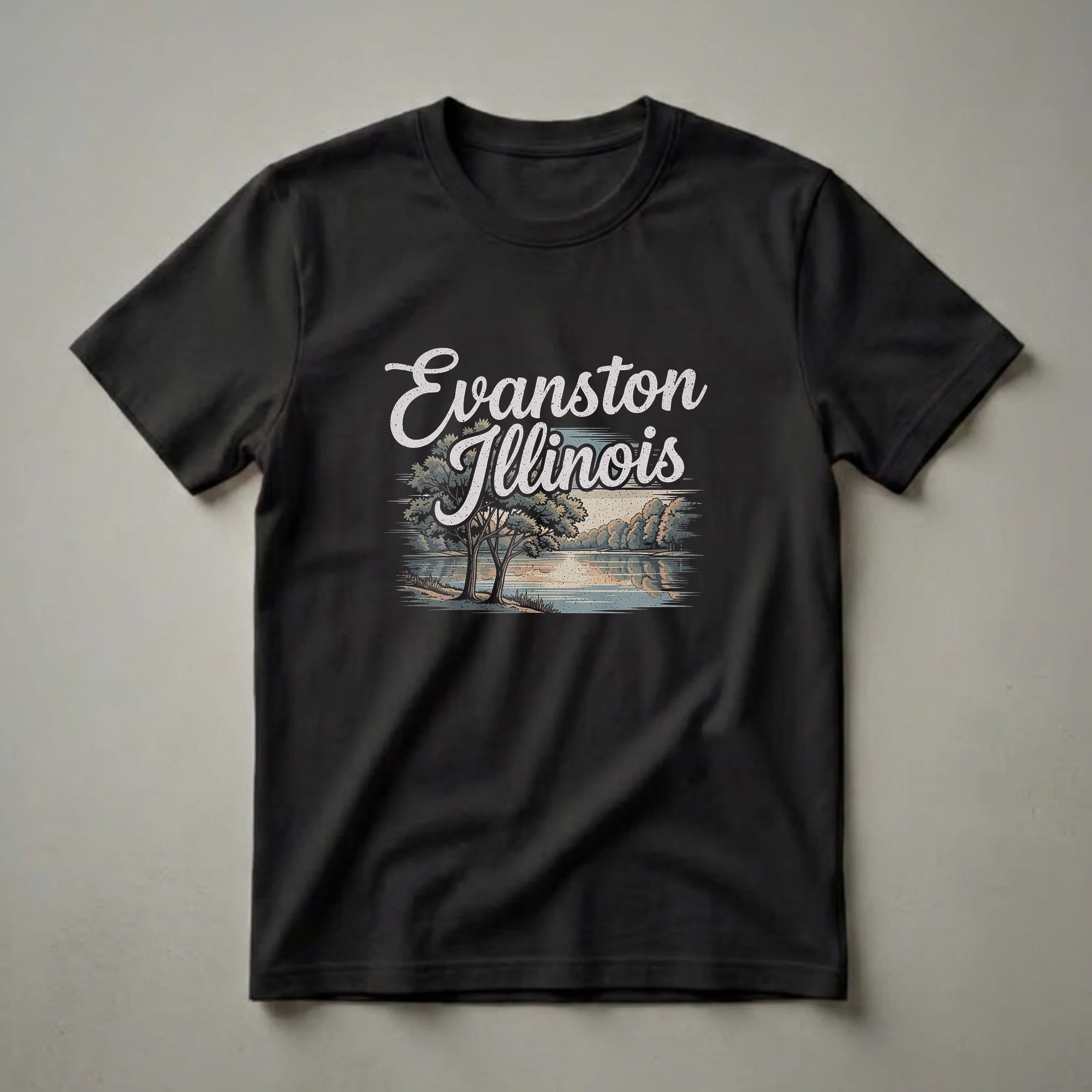 Evanston, Illinois residents who appreciate the beauty of their lakeside city will reach for this retro graphic tee. The design captures a serene lakefront scene, complete with lush trees and calm water reflecting the sky. Evanston, situated on the shores of Lake Michigan, is known for its vibrant community and picturesque views, making this shirt a perfect representation of local pride. This apparel is a thoughtful gift for anyone who calls Evanston home, whether they've lived there for years or are new to the area. Imagine wearing this t-shirt while strolling along the lakefront path or enjoying a picnic in one of Evanston's many beautiful parks. It’s a comfortable and stylish way to celebrate your connection to this charming Illinois city. The vintage-inspired artwork evokes a sense of nostalgia, appealing to those who cherish the unique character of Evanston. This graphic shirt is more than just clothing; it's a wearable piece of Evanston's identity, well suited for casual outings or as a conversation starter among fellow locals. It makes a thoughtful gift for friends and family who have a special place in their heart for Evanston.