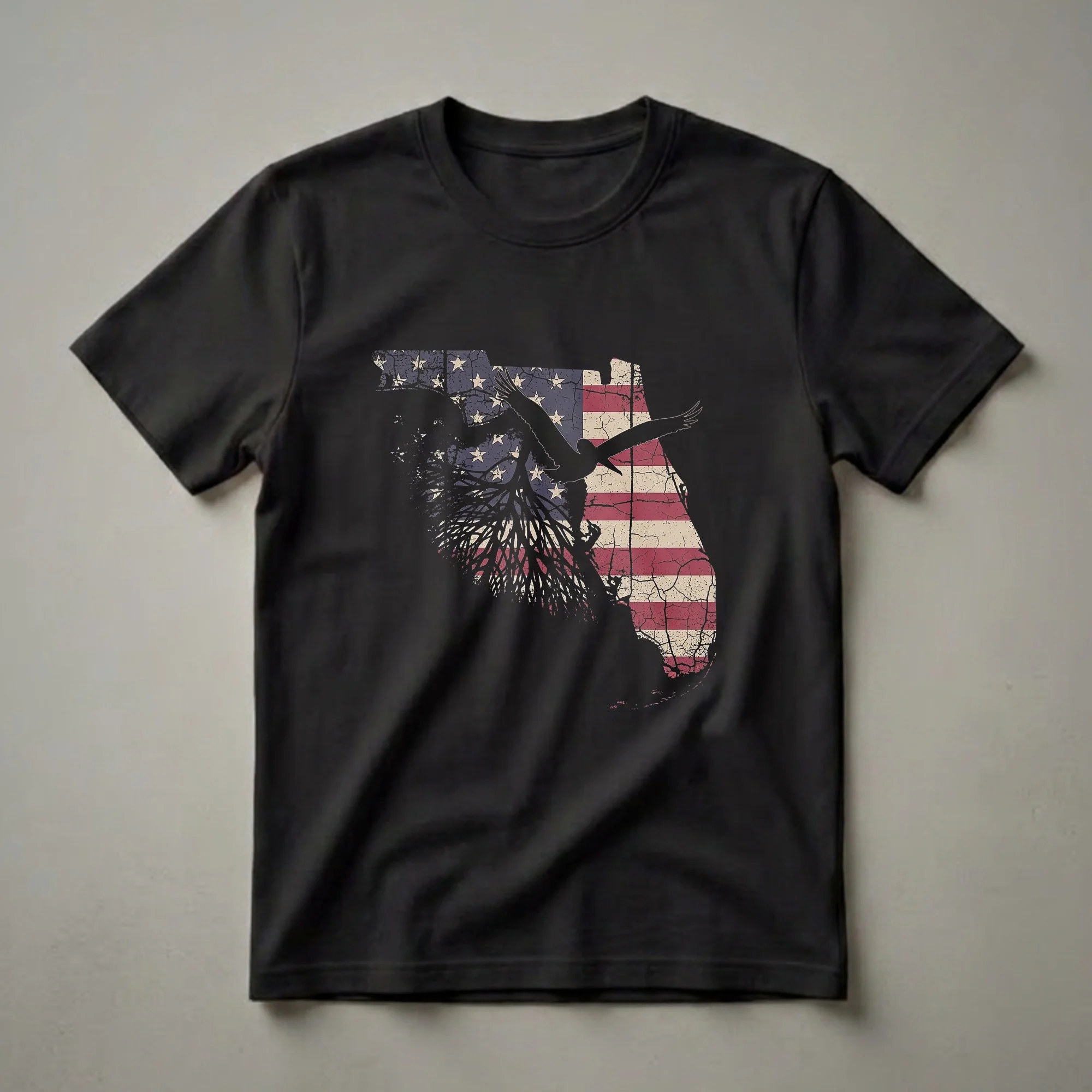 Floridians who cherish their state's unique identity will appreciate this striking graphic tee. The design showcases the outline of Florida filled with a distressed American flag, complete with cracked textures and faded colors, evoking a sense of history and resilience. Emerging from the flag's base are dark, intricate tree roots, symbolizing deep connections and heritage. Soaring above the roots and across the state's silhouette is a bold black eagle, a powerful emblem of freedom and the United States. This shirt is a visual representation of the Sunshine State's connection to American values and its natural beauty. It's a thoughtful gift for anyone who calls Florida home, whether they've lived there their whole lives or are proud snowbirds. This t-shirt works well for casual outings, beach trips, or simply showing off your state pride. Wear it to a local festival or a casual gathering to spark conversations about your love for Florida.