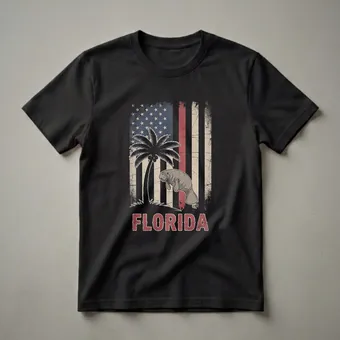 Florida residents and visitors who cherish the Sunshine State will appreciate this unique graphic tee. The design showcases a distressed American flag, a classic symbol of patriotism, overlaid with iconic Florida imagery. A silhouette of a palm tree, synonymous with tropical landscapes, stands tall against the flag's stripes. Prominently featured is a manatee, often called a 'sea cow,' a gentle marine mammal native to Florida's warm coastal waters and rivers. These fascinating creatures are a beloved symbol of the state's rich biodiversity. Below the imagery, the word 'FLORIDA' is emblazoned in a vintage-style font, reinforcing the state's identity. This t-shirt works well for anyone who loves Florida, whether they are a lifelong resident, a snowbird, or a vacationer seeking a memento. It makes a thoughtful gift for friends and family who have a special connection to the state. Wear this shirt to casual outings, beach trips, or while exploring Florida's many attractions, celebrating your love for the state and its unique wildlife.