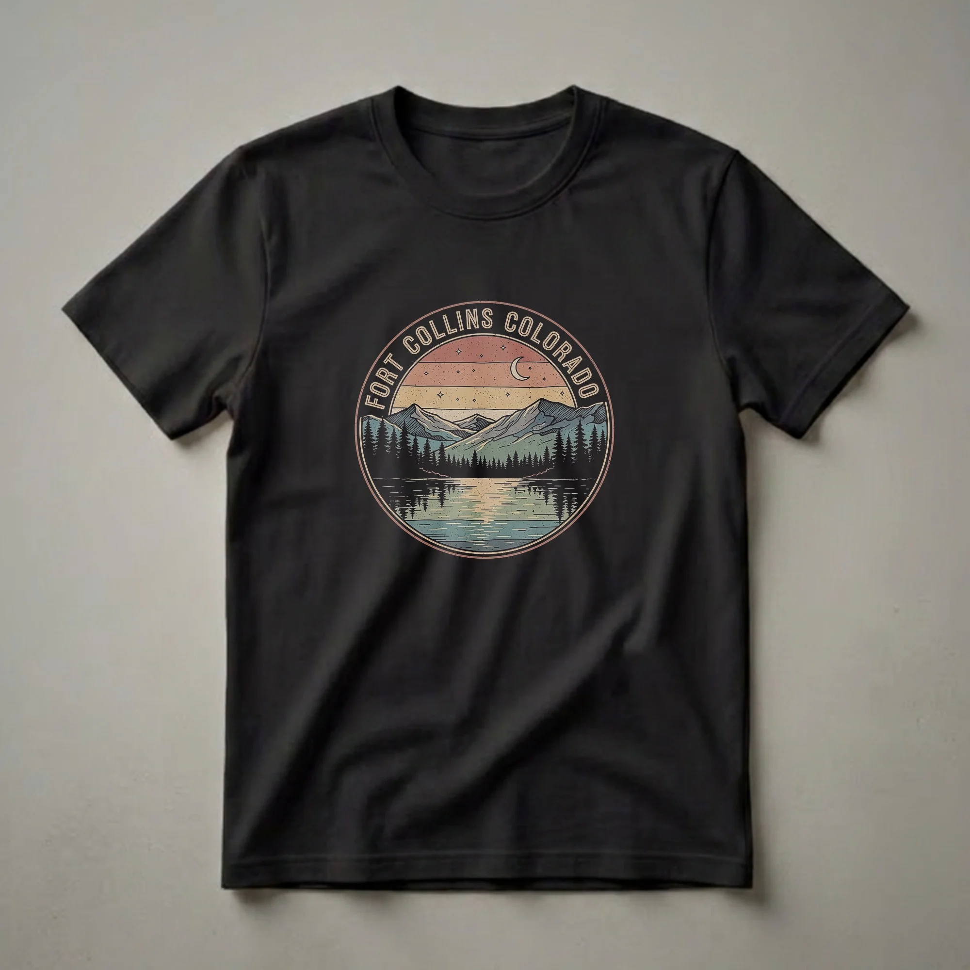 Fort Collins residents and visitors who appreciate the natural beauty of the Colorado Front Range will reach for this retro-inspired graphic tee. The design captures a tranquil mountain lake scene at dusk, complete with silhouetted pine trees, majestic peaks, and a crescent moon hanging in a starry sky. The circular emblem proudly displays "Fort Collins Colorado" in a vintage font, evoking a sense of nostalgia for this vibrant city nestled against the Rocky Mountains. Fort Collins is known for its access to outdoor recreation, including hiking and exploring nearby Horsetooth Mountain Open Space, making this shirt a perfect way to commemorate a visit or celebrate local pride. This comfortable t-shirt makes a thoughtful gift for anyone who cherishes the unique charm and scenic landscapes of Northern Colorado, whether they're a long-time resident or a frequent traveler to the area. Wear it on your next outdoor adventure or casual outing to showcase your connection to this picturesque mountain town.