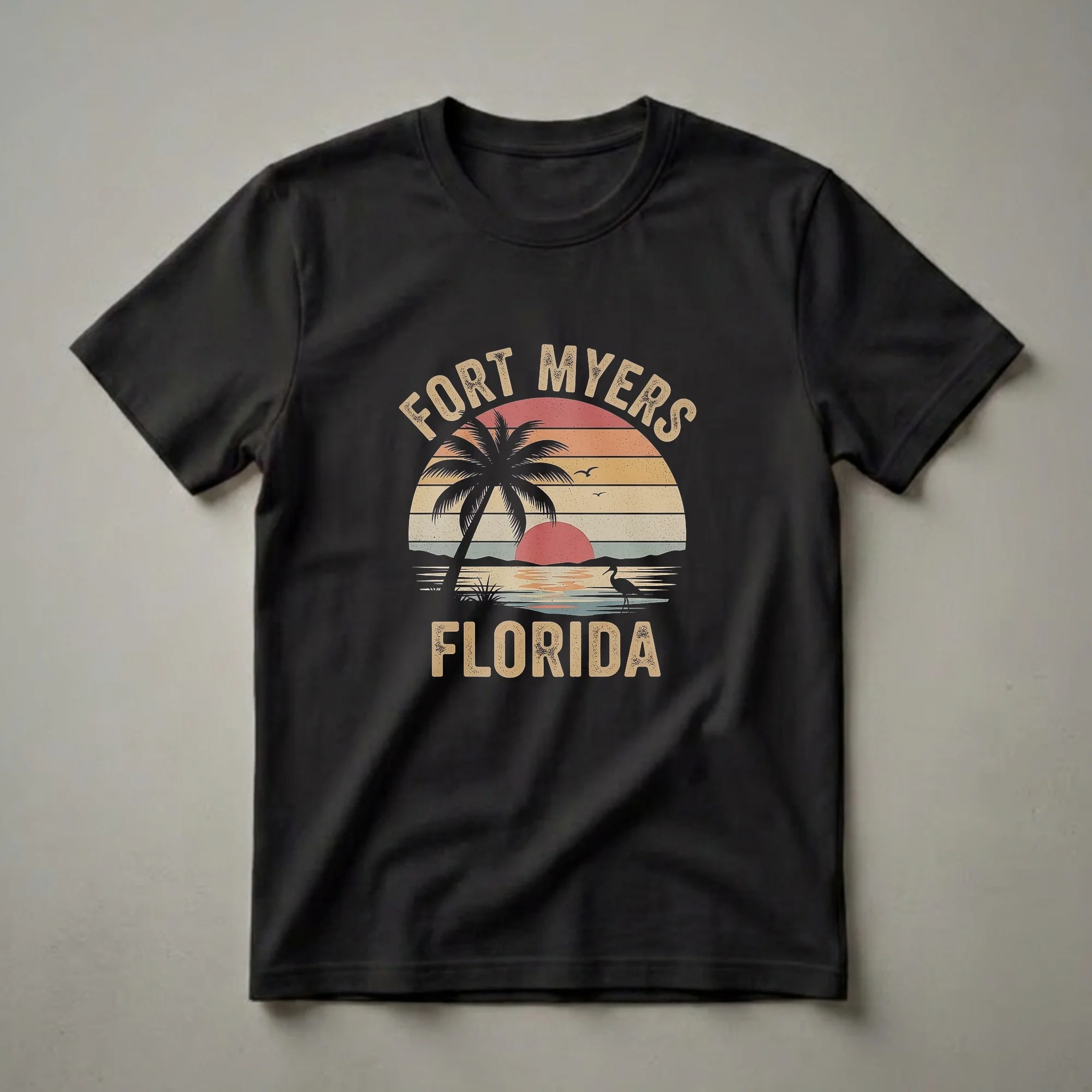 - Fort Myers Florida sunset graphic tee with silhouetted palm tree and wading bird.