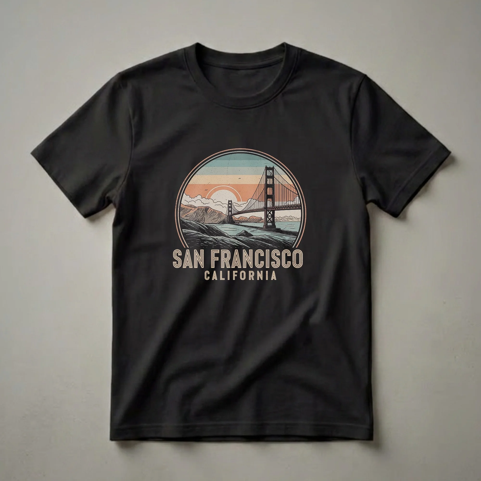 - Retro San Francisco Golden Gate Bridge graphic tee for California lovers.