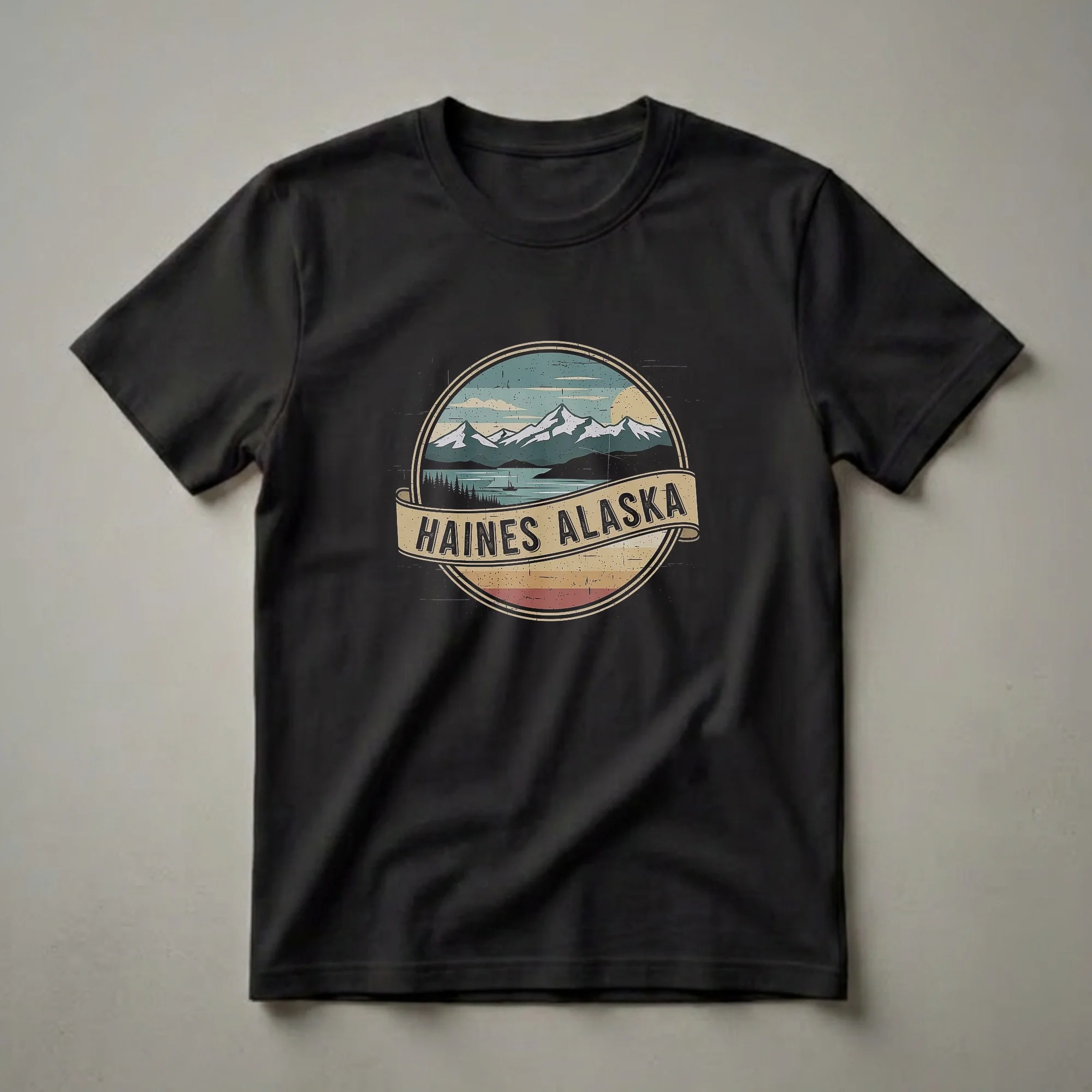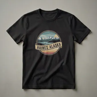 Travelers and wilderness enthusiasts who appreciate the rugged beauty of the Last Frontier will reach for this distinctive t-shirt. The design captures the essence of Haines, Alaska, a vibrant community nestled between mountains and the sea. This graphic tee showcases a circular emblem with a vintage aesthetic, depicting snow-capped mountains reflecting in a serene lake. A lone sailboat glides across the water, with a dense line of pine trees framing the foreground. A banner across the emblem proudly displays 'HAINES ALASKA' in bold, retro lettering. The color palette of muted blues, greens, and warm earth tones evokes a sense of nostalgia and adventure. Haines, known as the 'Valley of the Eagles,' is a gateway to stunning natural landscapes and abundant wildlife, making this shirt a wearable memento for anyone who has experienced its charm. This shirt works well for anyone who loves exploring the Alaskan wilderness or cherishing memories of their visit. It makes a thoughtful gift for the adventurer in your life who dreams of the north. Wear this tee on your next outdoor excursion or casual outing to share your Alaskan spirit.