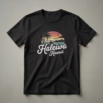 - Retro Haleiwa Hawaii graphic tee for surfers and beach lovers.