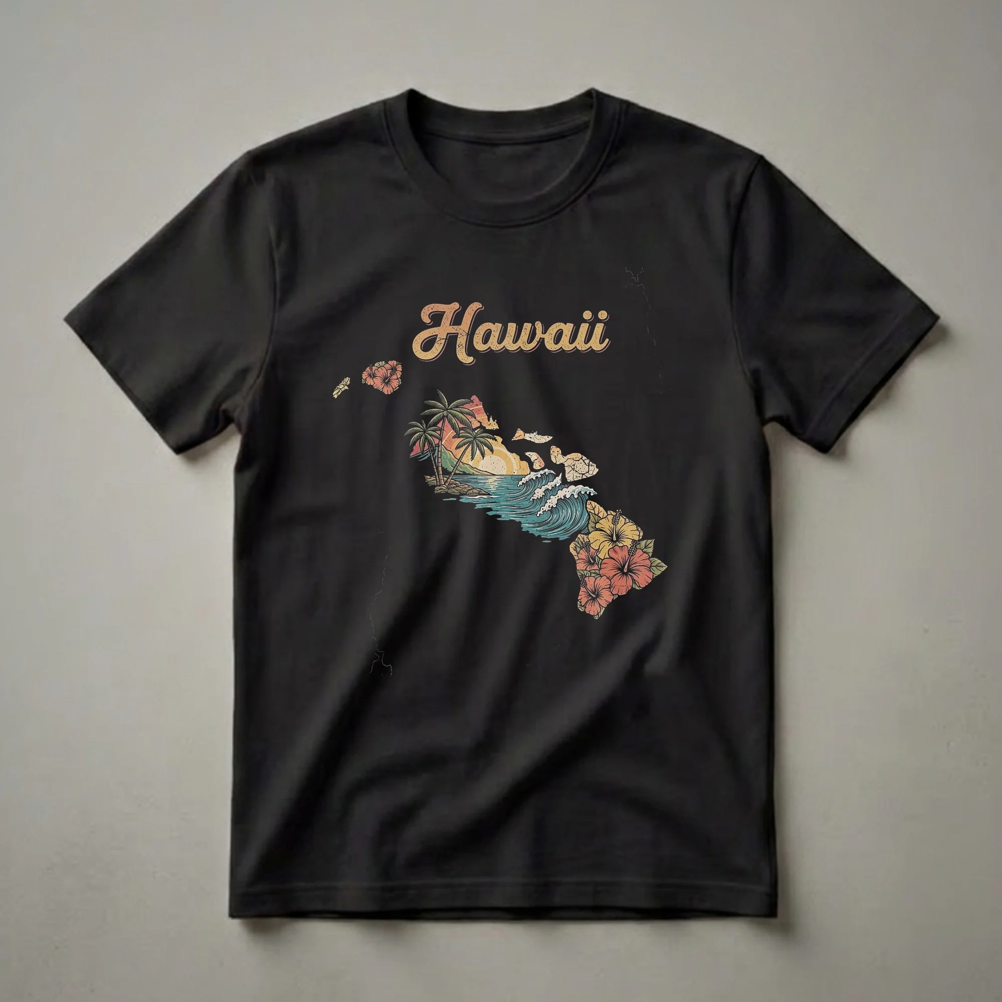 Hover to zoom · tap to expand Retro Hawaii Map Tropical Beach Scene T-Shirt for Island Lovers
