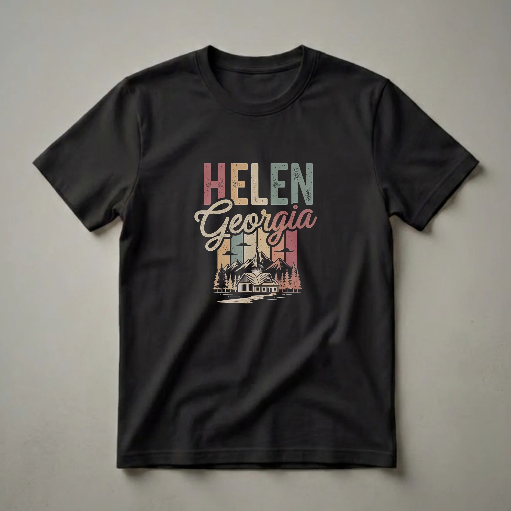 Helen, Georgia, a charming Bavarian-inspired village nestled in the North Georgia mountains, is celebrated in this retro graphic tee. The design showcases the town's distinctive architecture, with a building featuring a prominent steeple, set against a backdrop of majestic mountains and dense pine trees. The word 'HELEN' is displayed in bold, distressed block letters across the top, with 'Georgia' written in a flowing script below. This t-shirt is a thoughtful gift for anyone who has visited or lived in Helen, or for those who appreciate the unique charm of this mountain town. It's a perfect way to remember a trip to the Chattahoochee River or the surrounding Blue Ridge Mountains. Wear this shirt to recall fond memories of exploring the shops and restaurants, or as a casual statement piece that highlights your connection to this unique Georgia destination. This apparel is a staple for any Georgiana enthusiast.