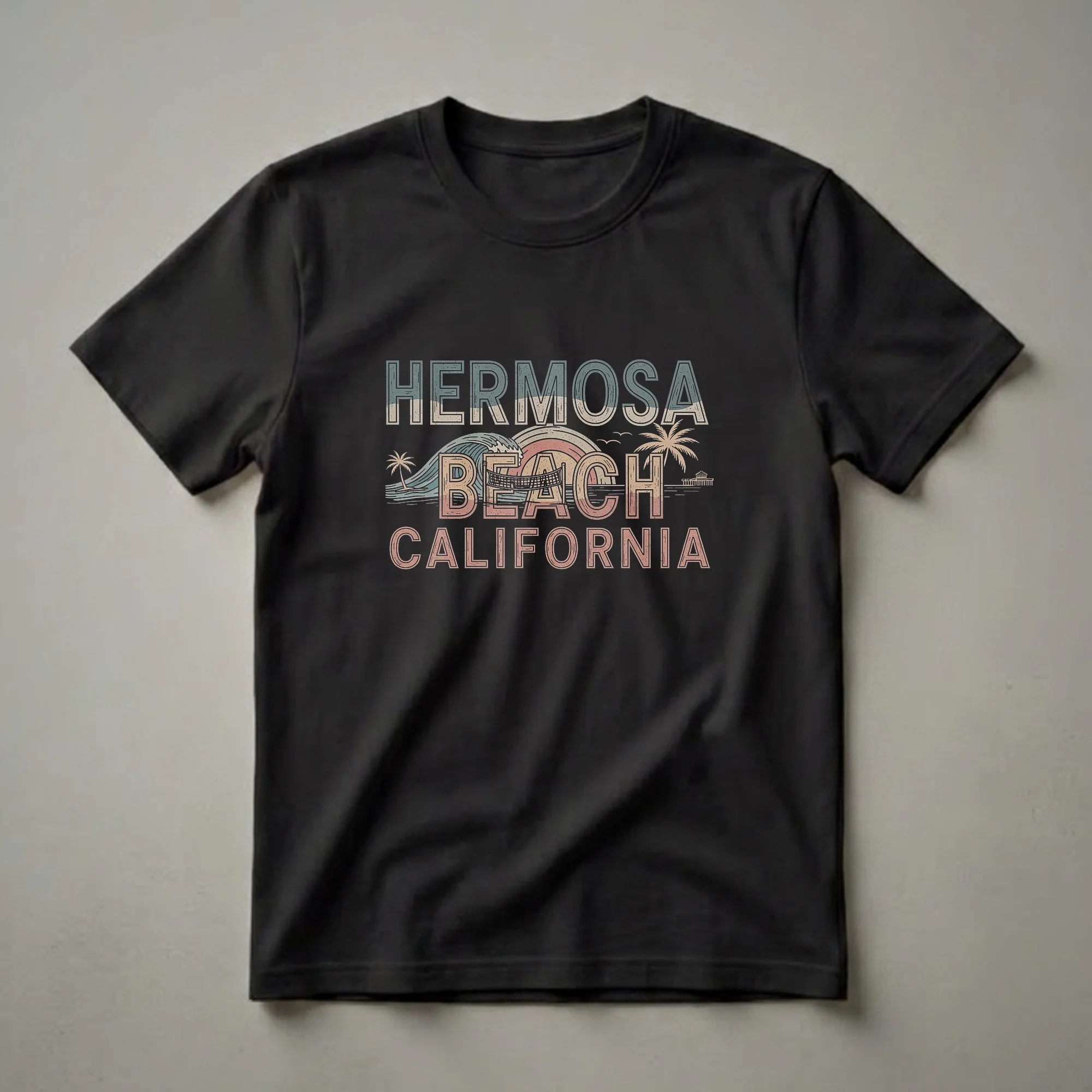 - Retro Hermosa Beach California graphic tee for beach lovers.