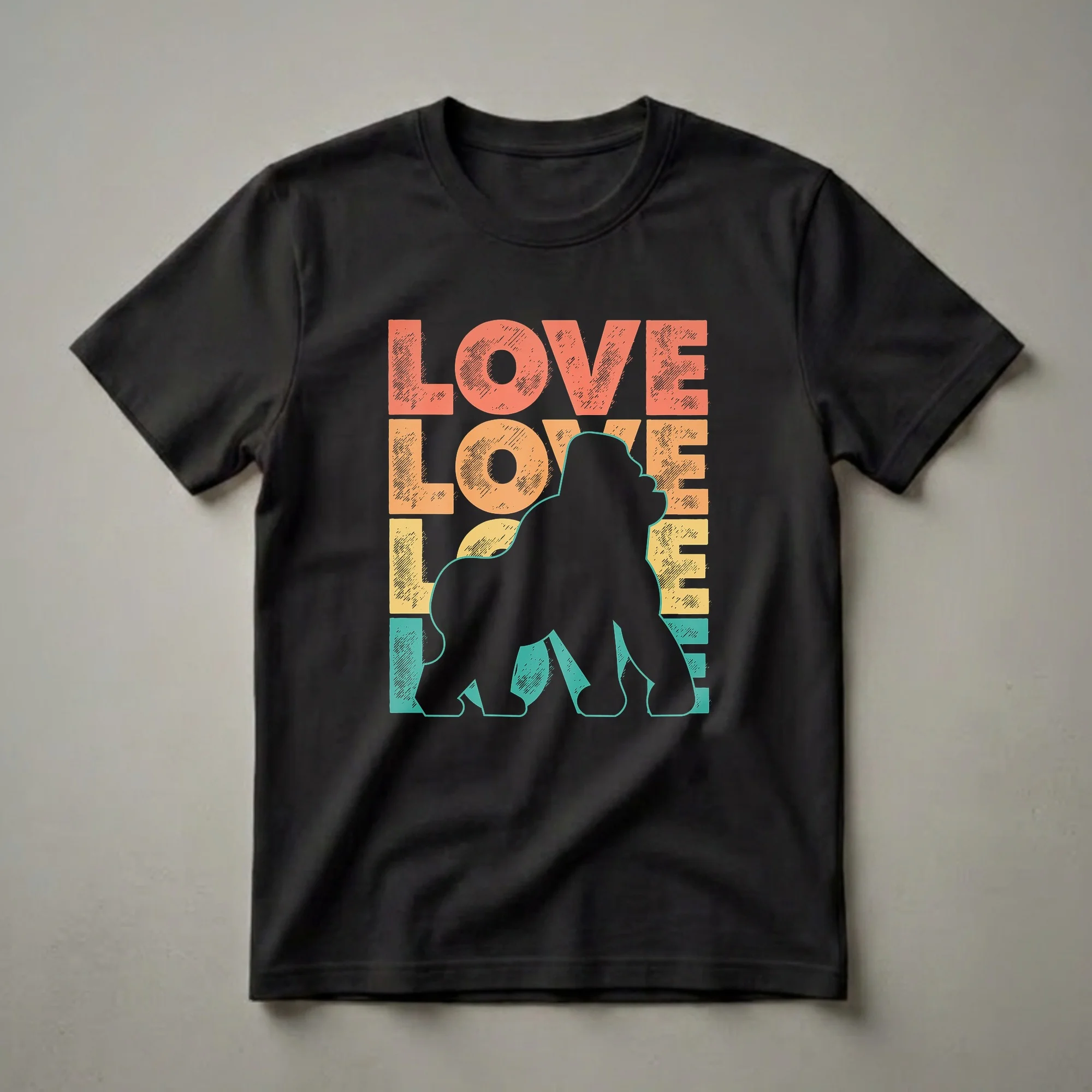 Primate enthusiasts and wildlife lovers who want their admiration for gorillas to show up in their wardrobe will reach for this retro graphic tee. The design stacks LOVE four times in bold distressed block lettering, coral red, orange, yellow, teal, covering the shirt with color. A large black gorilla silhouette with a teal outline is overlaid across the middle rows, the animal rendered in a standing profile that emphasizes its broad shoulders and powerful build. Gorillas (Gorilla gorilla and Gorilla beringei) are the largest living primates, native to the equatorial forests of central sub-Saharan Africa. Western lowland gorillas are the most numerous, with populations in the forests of Cameroon, the Central African Republic, the Democratic Republic of Congo, Equatorial Guinea, Gabon, and the Republic of Congo. Mountain gorillas, famously studied by primatologist Dian Fossey in the Virunga Mountains, remain critically endangered with fewer than 1,100 individuals left in the wild. The species forms complex social groups called troops, led by a dominant silverback male who protects the group and adjudicates conflicts. This shirt works well for wildlife conservationists, zoo volunteers, biology students, and anyone who read Koko the Gorilla's story as a child and never quite got over it. It makes a thoughtful gift for a wildlife enthusiast on a birthday, or a conservation advocate who wears their cause. Wear it to a zoo visit, a nature documentary night, or casual wear that starts real conversations.