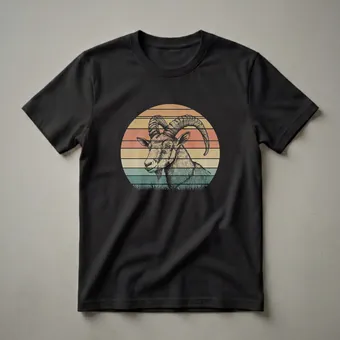 Mountain goat enthusiasts will appreciate this striking graphic tee featuring a detailed illustration of an ibex. The artwork is presented within a circular retro sunset design, complete with horizontal stripes in warm, faded tones of orange, yellow, and teal, evoking a vintage aesthetic. The goat's impressive, curved horns and textured fur are rendered with fine linework, giving the image a classic, etched appearance. Below the sunset, a silhouette of grassy terrain grounds the design. Ibex, a species of wild goat known for their magnificent horns and ability to navigate steep mountain terrains, are often found in the rocky, high-altitude regions of Europe and Asia. This shirt is a thoughtful gift for any woman or man who admires these resilient creatures or enjoys hiking and exploring mountainous landscapes. It's a staple in the collection for anyone who loves wildlife art and retro designs. Wear this t-shirt on your next outdoor adventure or casual outing to express your passion for nature and majestic animals.